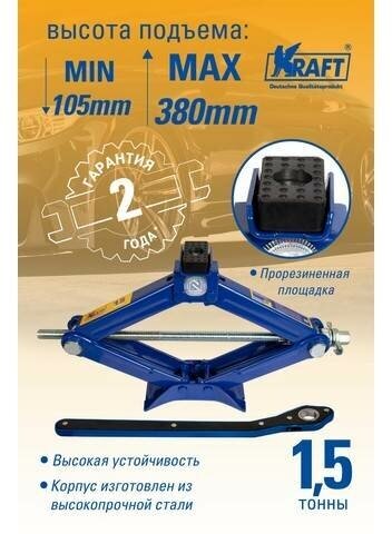 Домкрат ромбический 1,5 т. Kraft с трещоточной рукояткой 105-380 мм