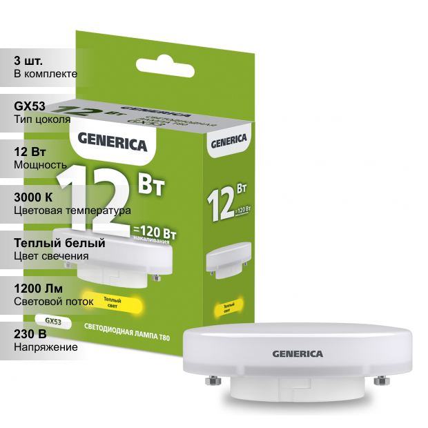 Лампочка светодиодная GENERICA 12Вт=120Вт 4000К нейтральный свет GX53 T80 таблетка (комплект из 3 шт.)