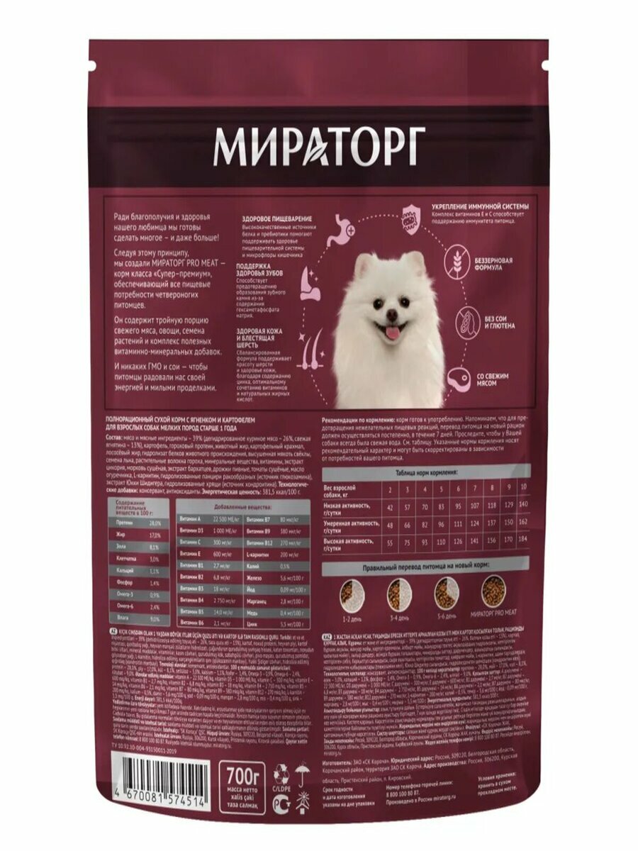 Мираторг Pro Meat 700 г сухой корм для взрослых собак мелких пород старше 1 года с ягненком и картофелем 1 шт