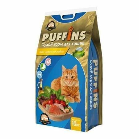 Сухой корм для кошек Puffins, с курицей и рыбой, 10 кг