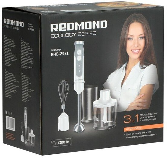 Блендер REDMOND RHB-2921, погружной, 1300 Вт, 0.5/0.5 л, 6 скоростей, режим "турбо", белый