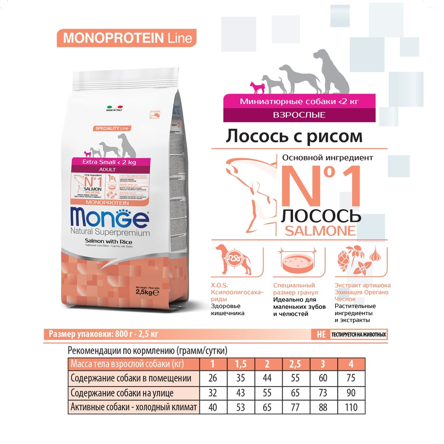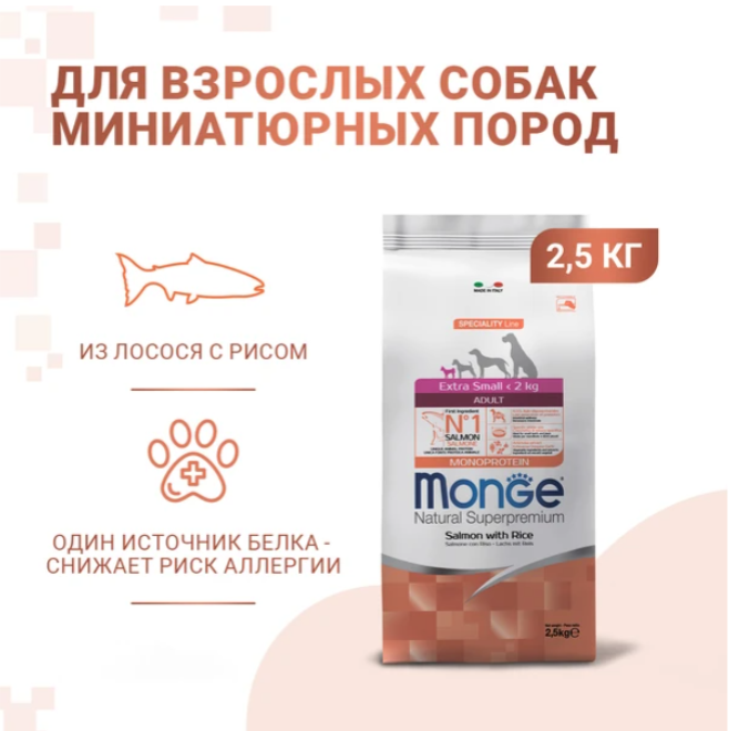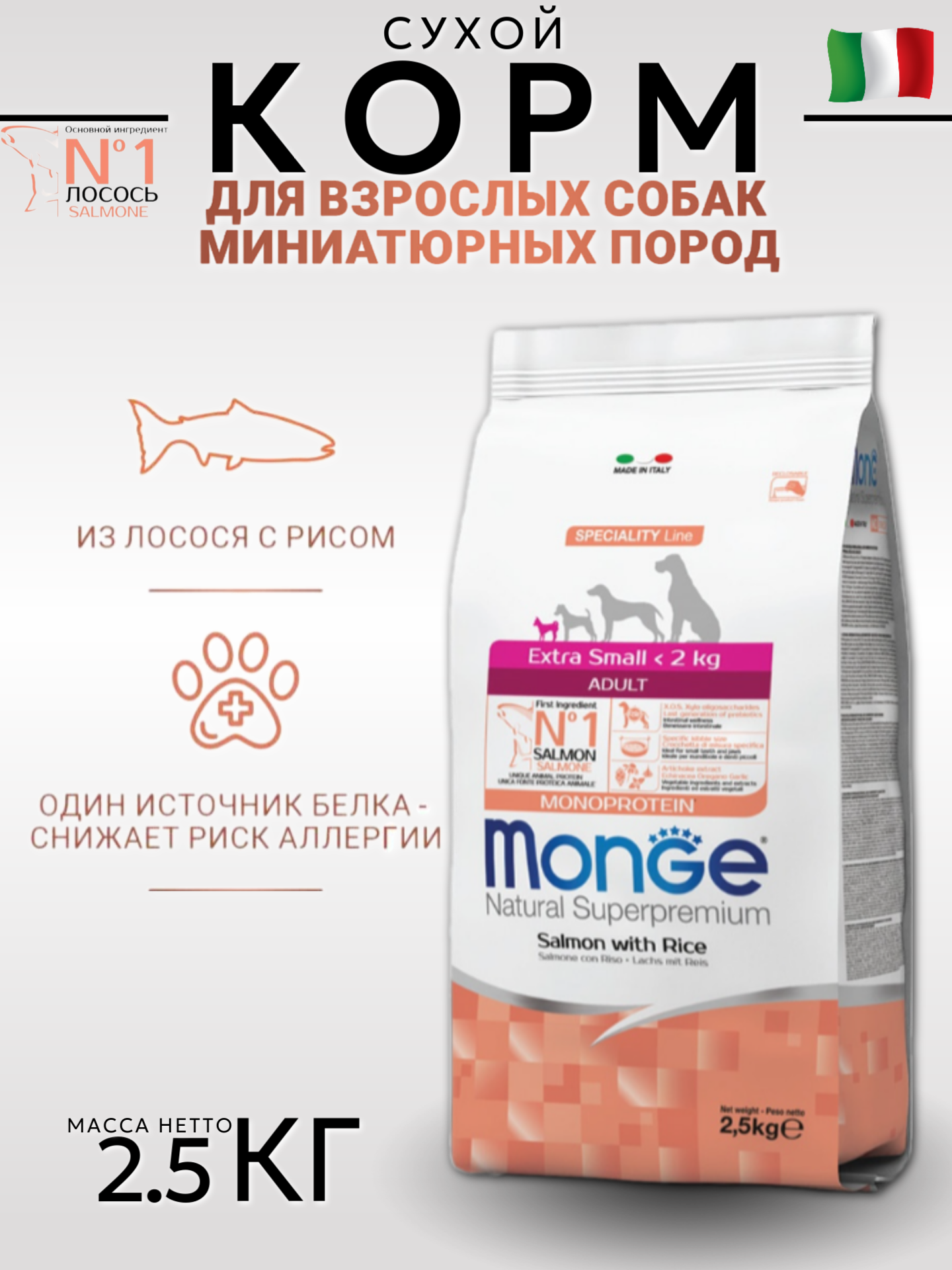 Купить Сухой корм Monge Dog Speciality Line Monoprotein Extra Small для взрослых собак миниатюрных пород, с лососем и рисом 2,5 кг