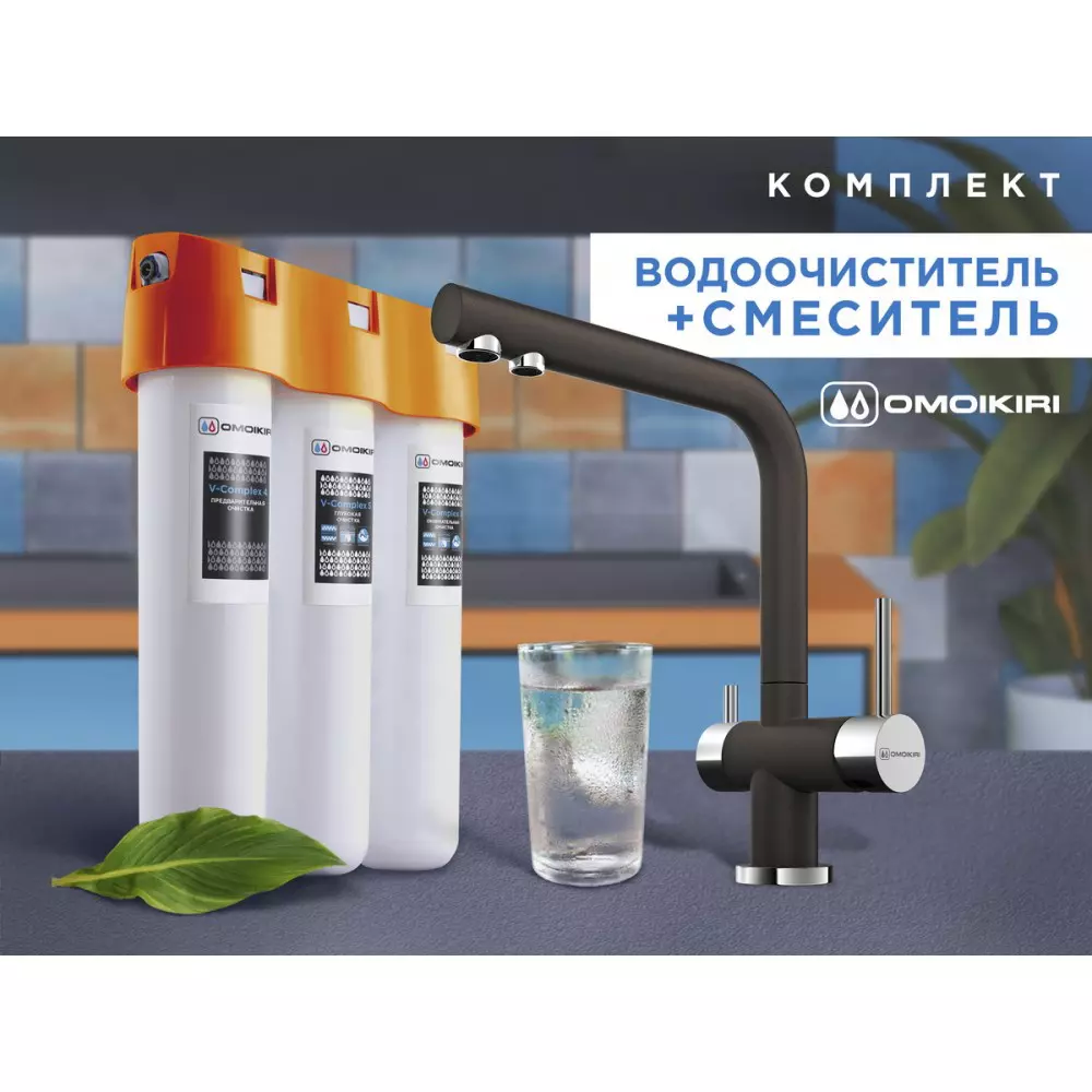 Комплект смеситель для кухни Omoikiri Nagano-DC кран фильтрованной воды, водоочиститель Pure drop Lite, тёмный шоколад 4048.8028