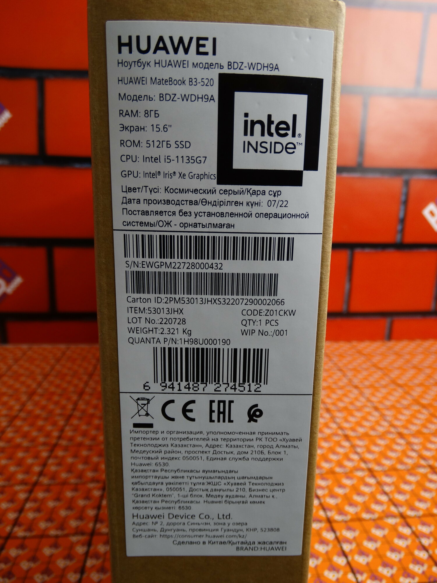 Huawei MateBook B3-520 BDZ-WDH9A [53012KFG] Grey 15.6" {FHD i5-1135G7/8Gb/512Gb SSD/Win10Pro}