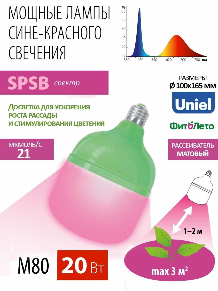 Лампа светодиодная для растений Uniel cпектр для рассады и цветения LED-M80-20W/SPSB/E27/FR PLS55GR