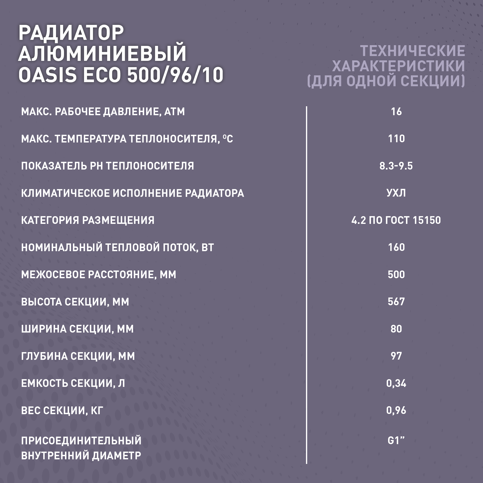 Радиатор алюминиевый OASIS ЭКО 500/96/ 10 секций 160Вт/секция Россия