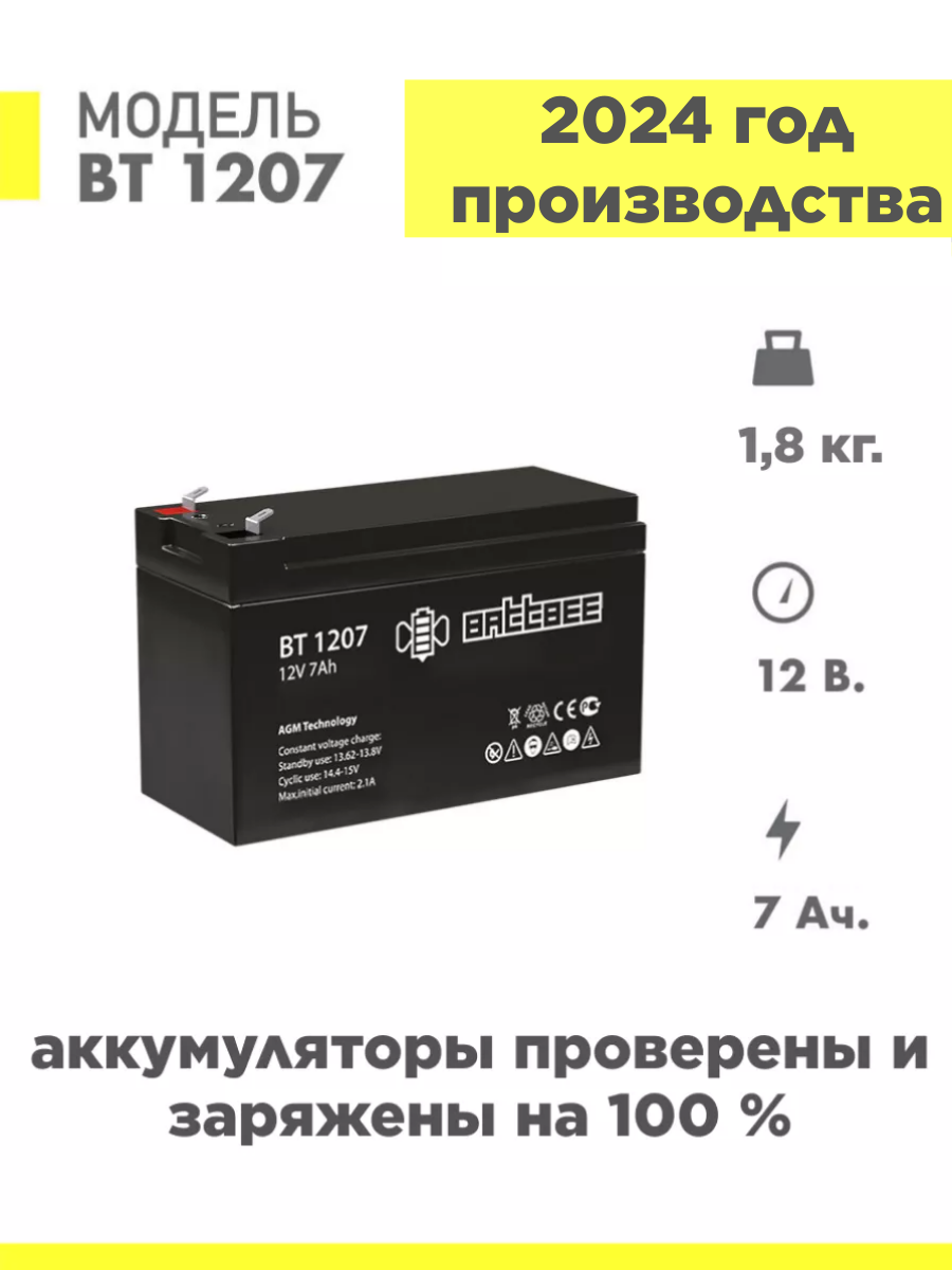 Аккумуляторная батарея Battbee BT 1207 12 В 7 Ач для ИБП,UPS, аккумулятор для детского электромобиля, эхолота