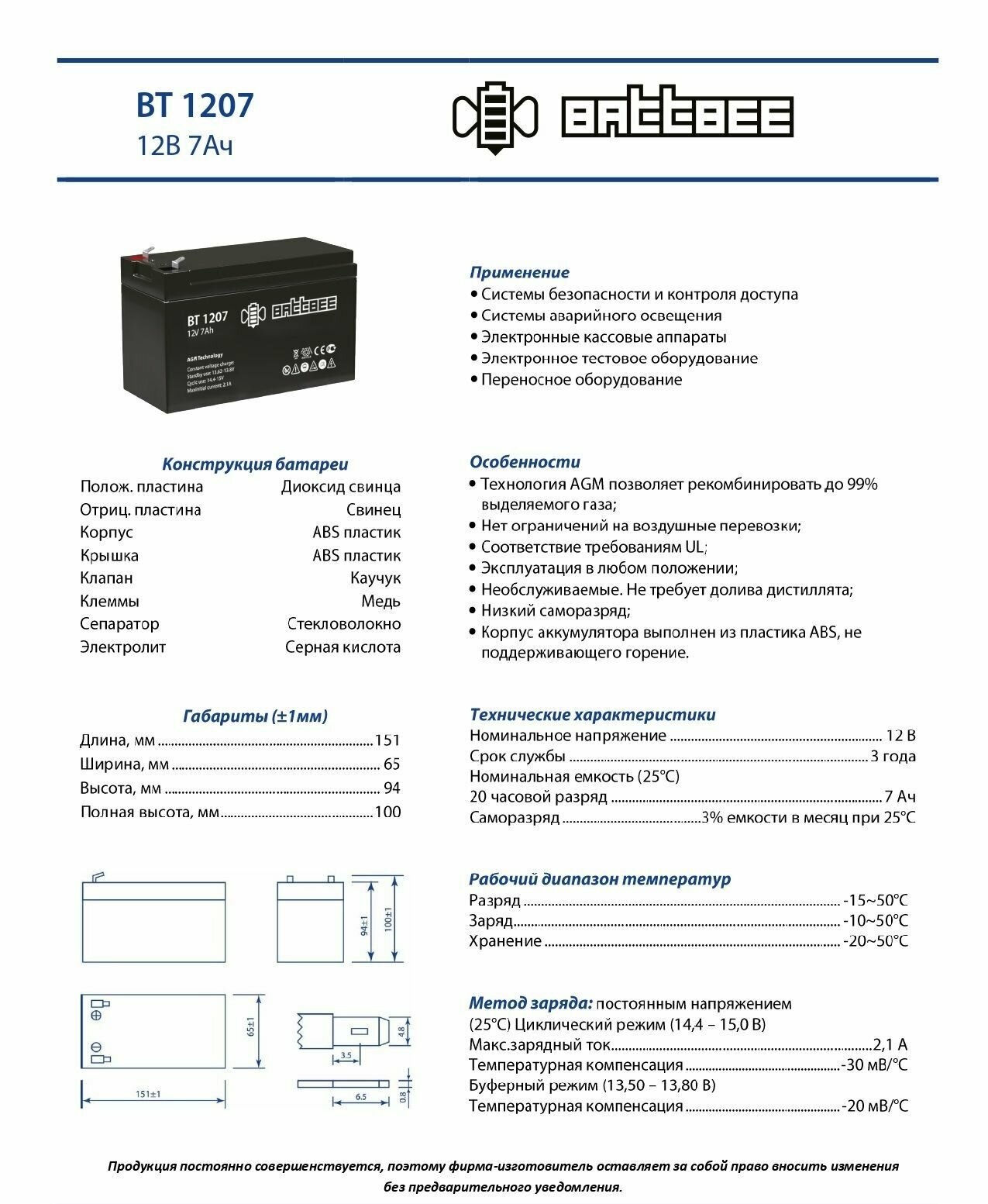 Аккумуляторная батарея Battbee BT-1207 (12В, 7Ач / 12V, 7Ah ) клемма F1