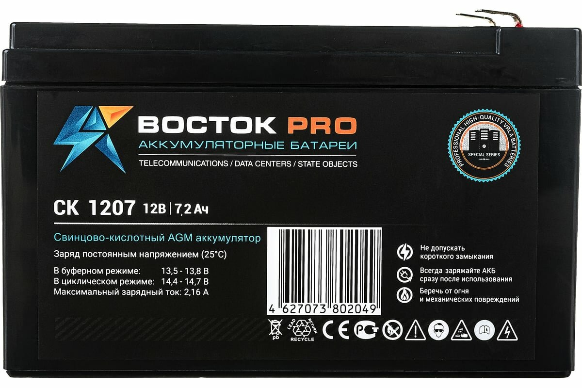 Аккумулятор восток PRO CK-1207 (12В, 7.2Ач / 12V, 7.2Ah / вывод F2) (UPS серия)