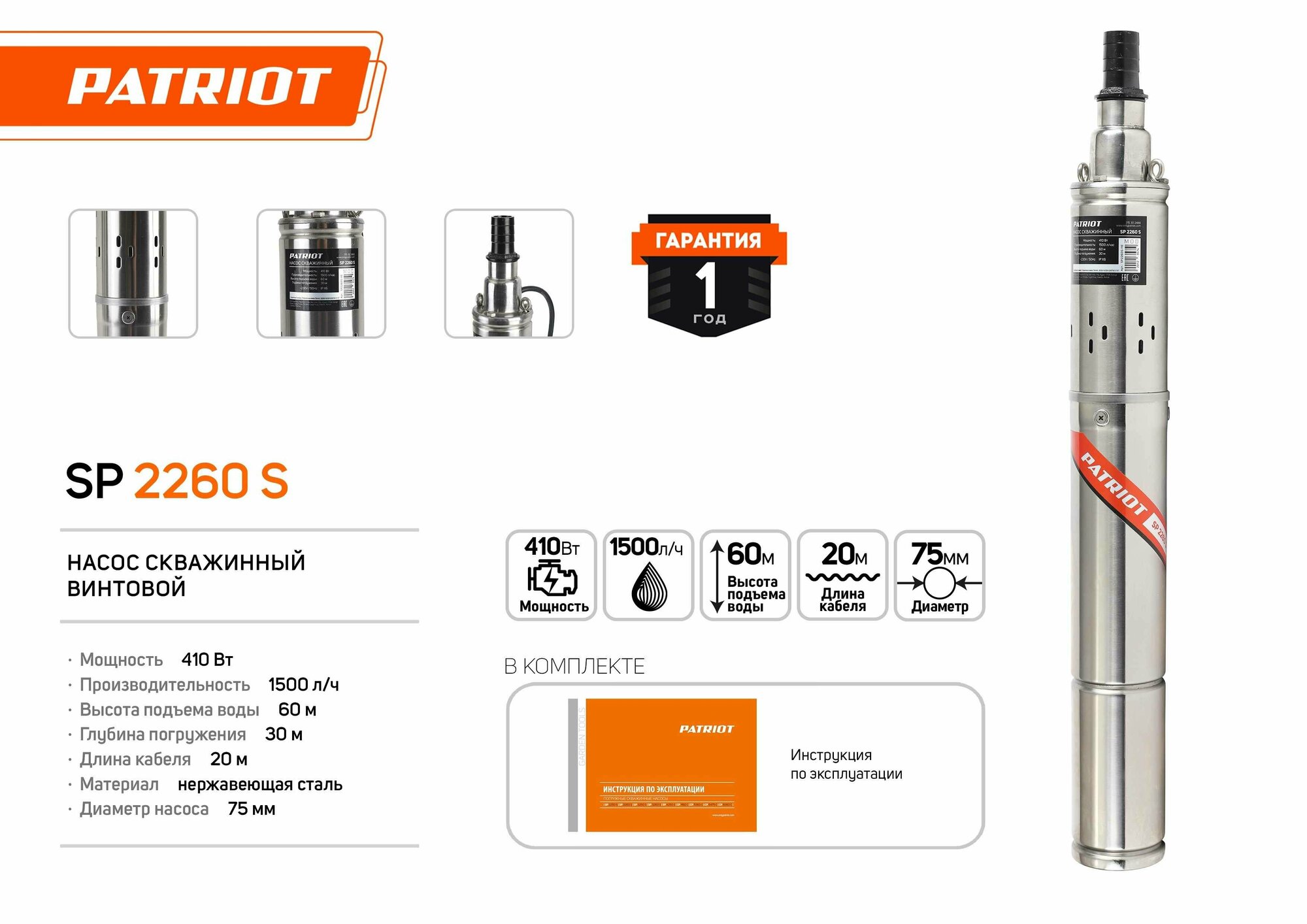 Насос погружной скважинный PATRIOT SP 2260 S, 410Вт, глубина 30м интересное:
