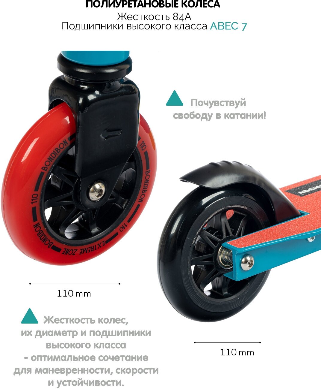 Самокат детский BONDIBON STIX, PU колеса 110 мм с пластик.ободом, жесткость PU 84A, abec7, зажим 3 б