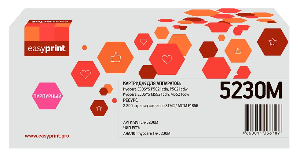 EasyPrint Тонер-картридж для Kyocera ECOSYS M5521cdn, P5021cdn (2200 стр.) пурпурный, с чипом LK-5230M