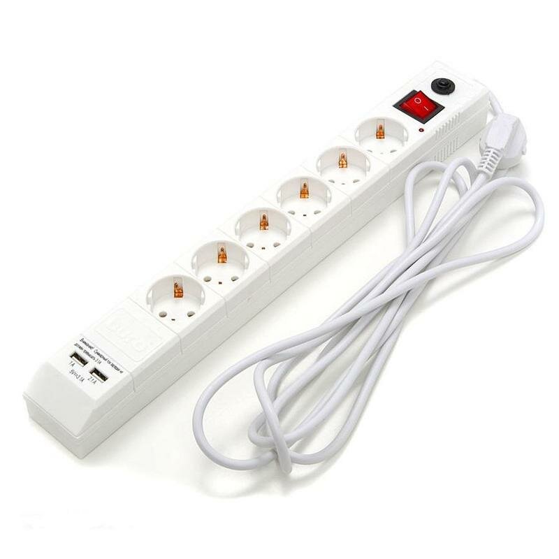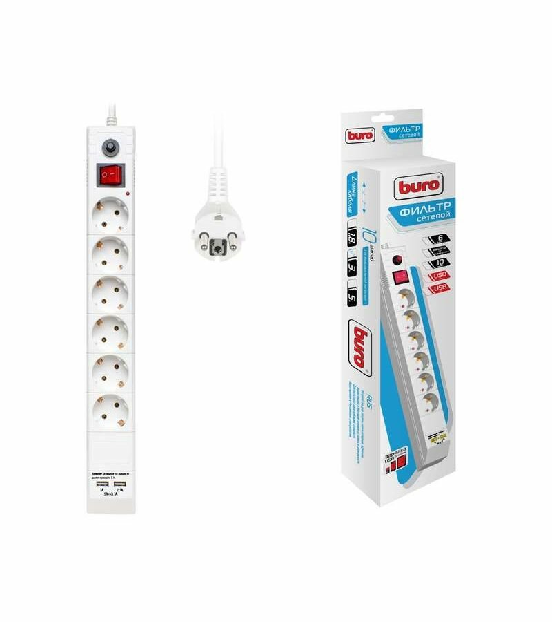 Сетевой фильтр Buro BU-SP3_USB_2A-W, 6 розеток, 3 м, с/з, 10А / 2200 Вт