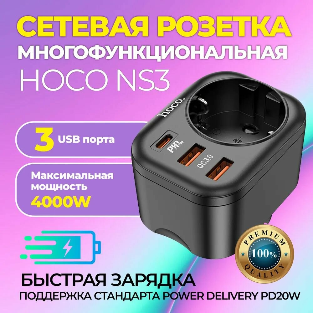 Многофункциональная розетка/Сетевой фильтр HOCO NS3, 1 гнездо + USB-C(PD 20W) + 2USB QC3.0 18W, Черный