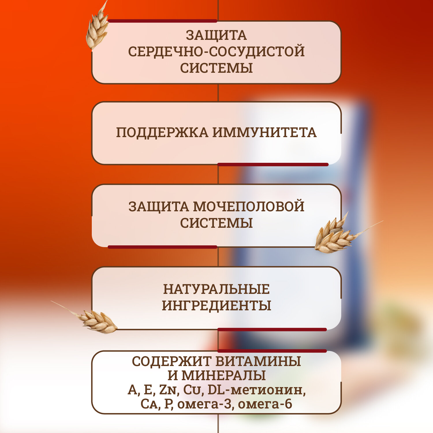 | Пищевая ценность | влажность — 8.2%, сырой белок — 31.0%, сырые жиры и масла — 17.5%, сырая клетчатка — 1.0%, сырая зола — 9.0%, кальций — 1.2%, фосфор — 1.0%, Омега-3 — 1.5%, Oмега-6 — 3.0% |