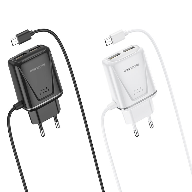 Устройство зарядное сетевое micro USB, 2 USB Borofone, BA50A, 2100mAh, пластик, кабель 1.0м, цвет: чёрный