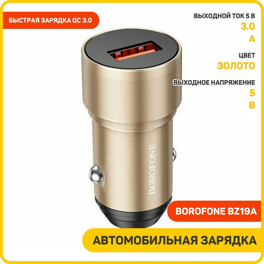 Автомобильное ЗУ Borofone BZ19A, Быстрая зарядка, Quick Charge 3.0, золотой