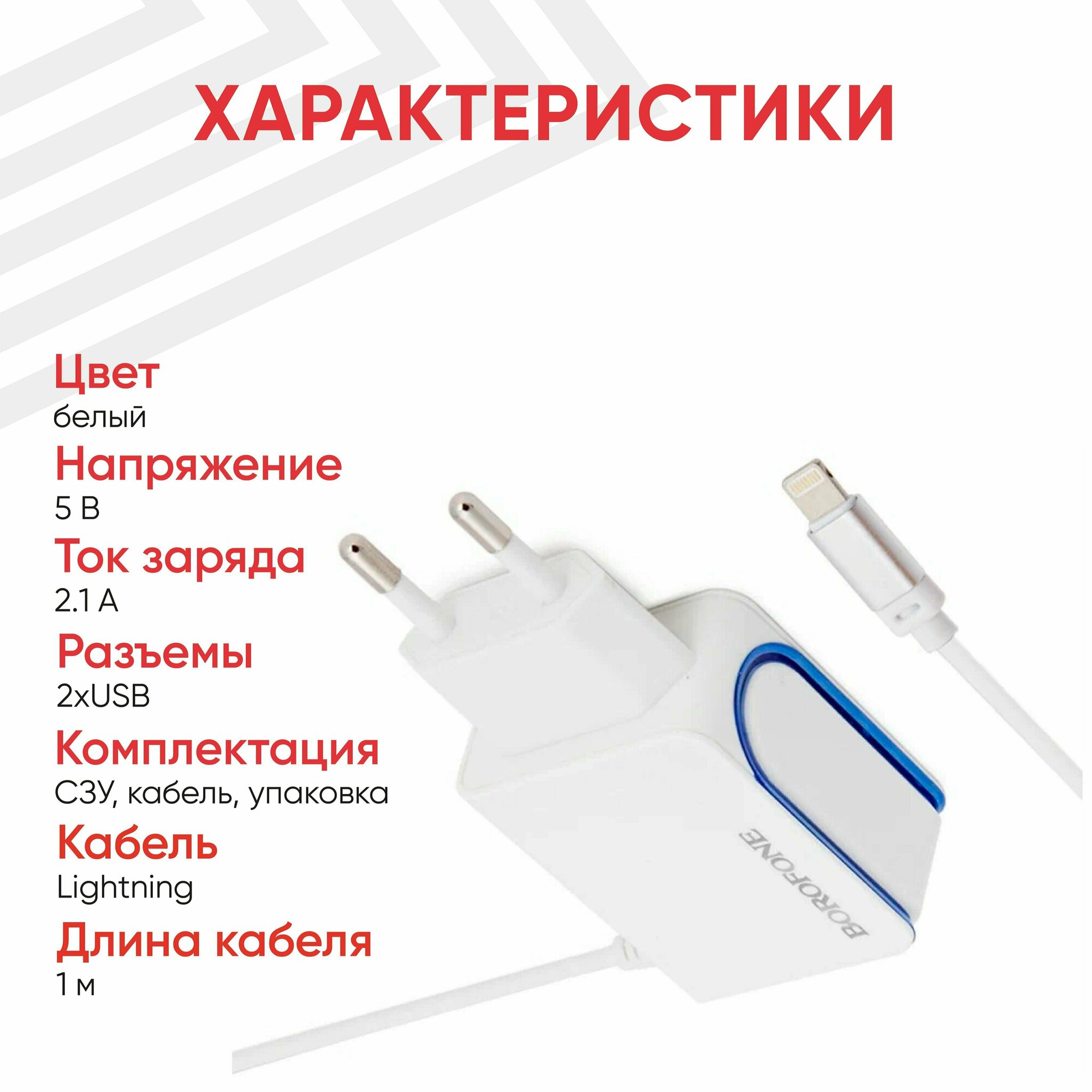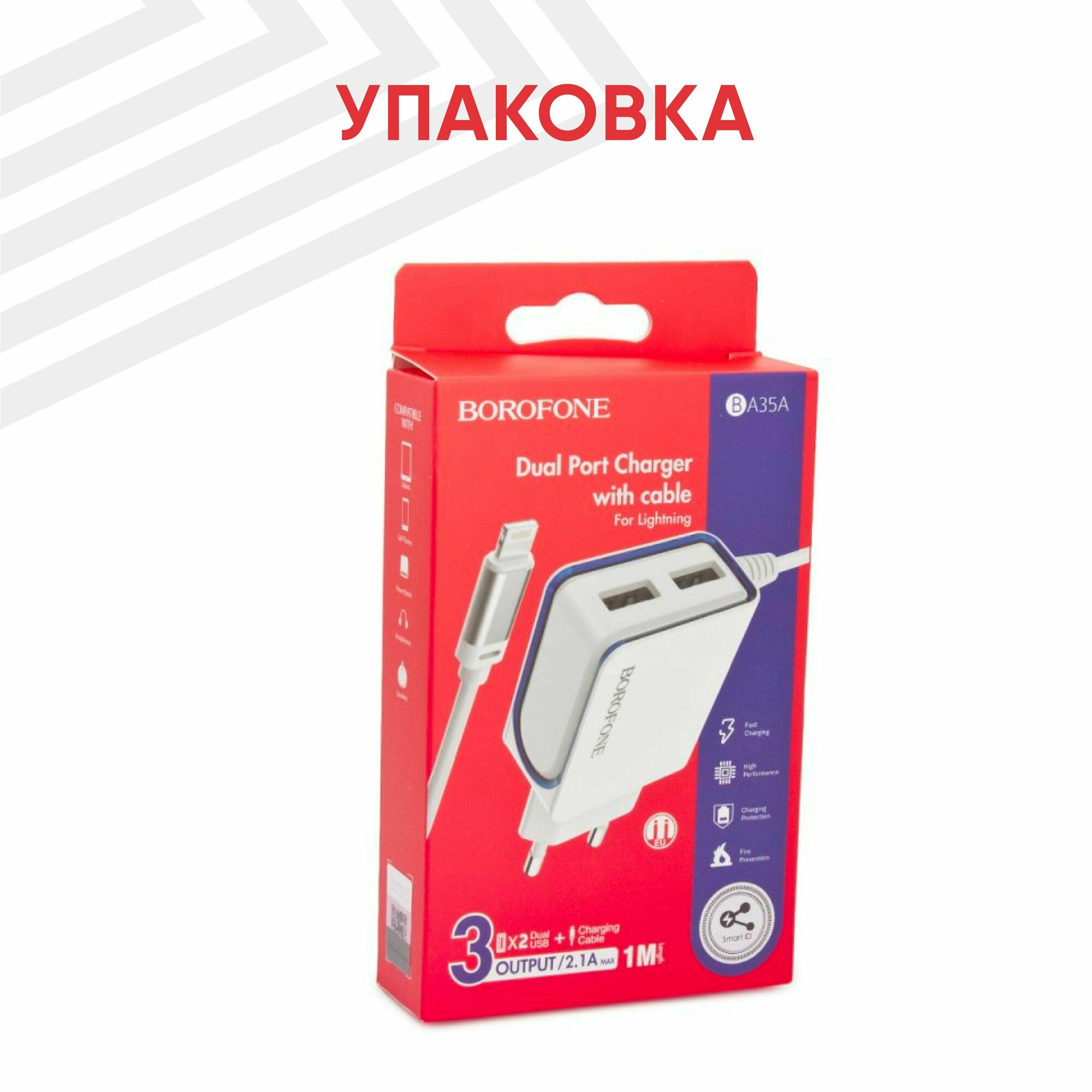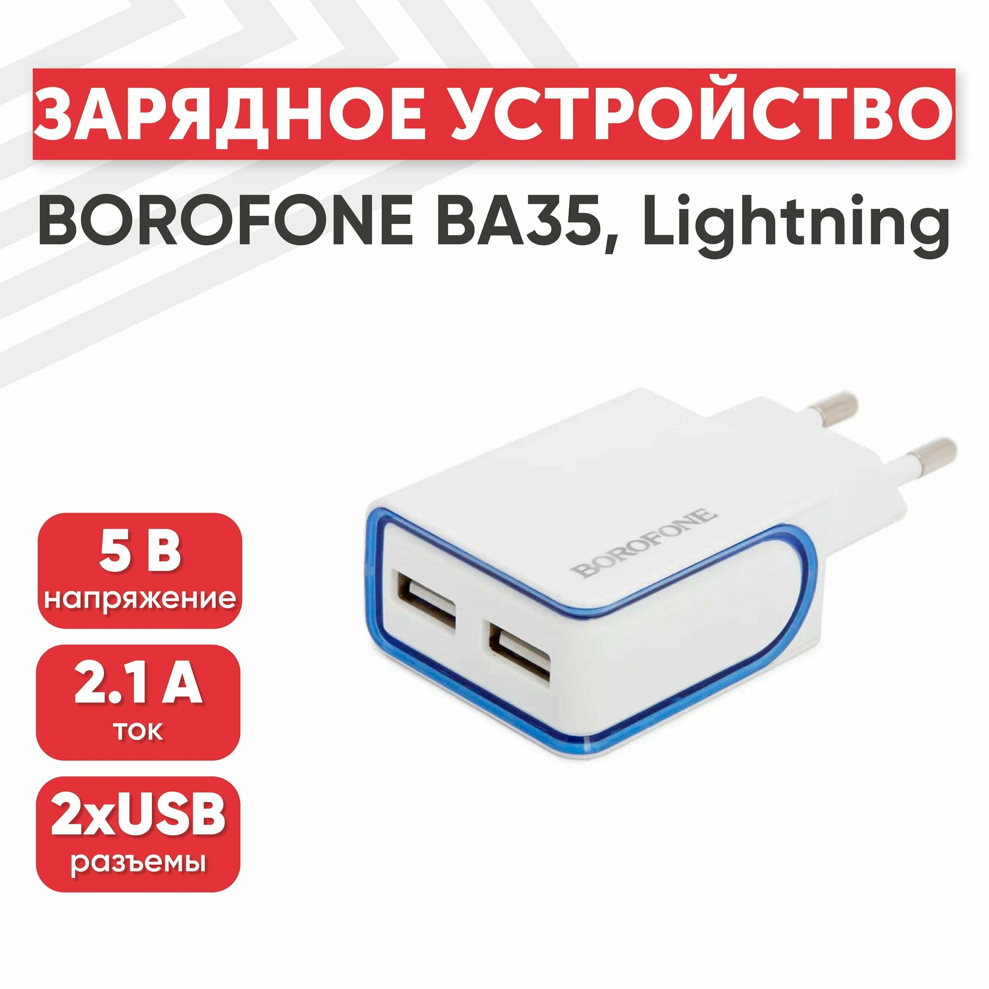 Сетевое зарядное устройство (адаптер) Borofone BA35, 2 USB Type-A, 2.1А, интегрированный кабель Lightning 8-pin, 1м, белый интересное: