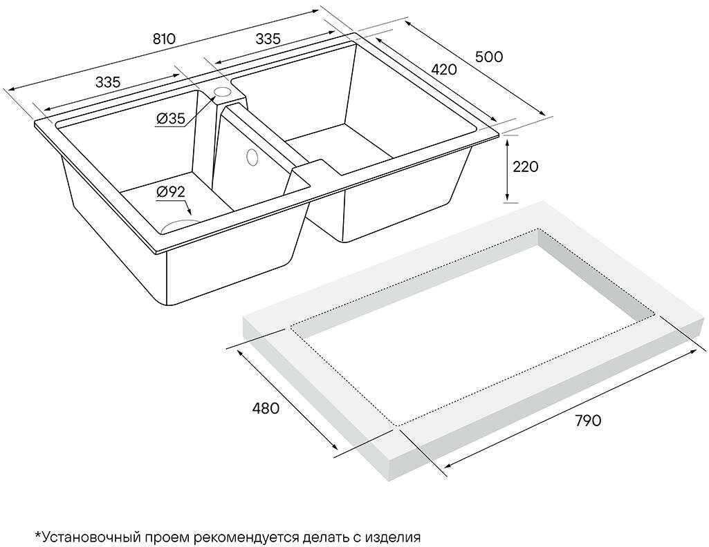 Мойка для кухни врезная Paulmark TANDEM 80/2, 810х510 мм, две равные чаши, гранитная, готовое отверстие под смеситель, цвет черный, PM238150-BL