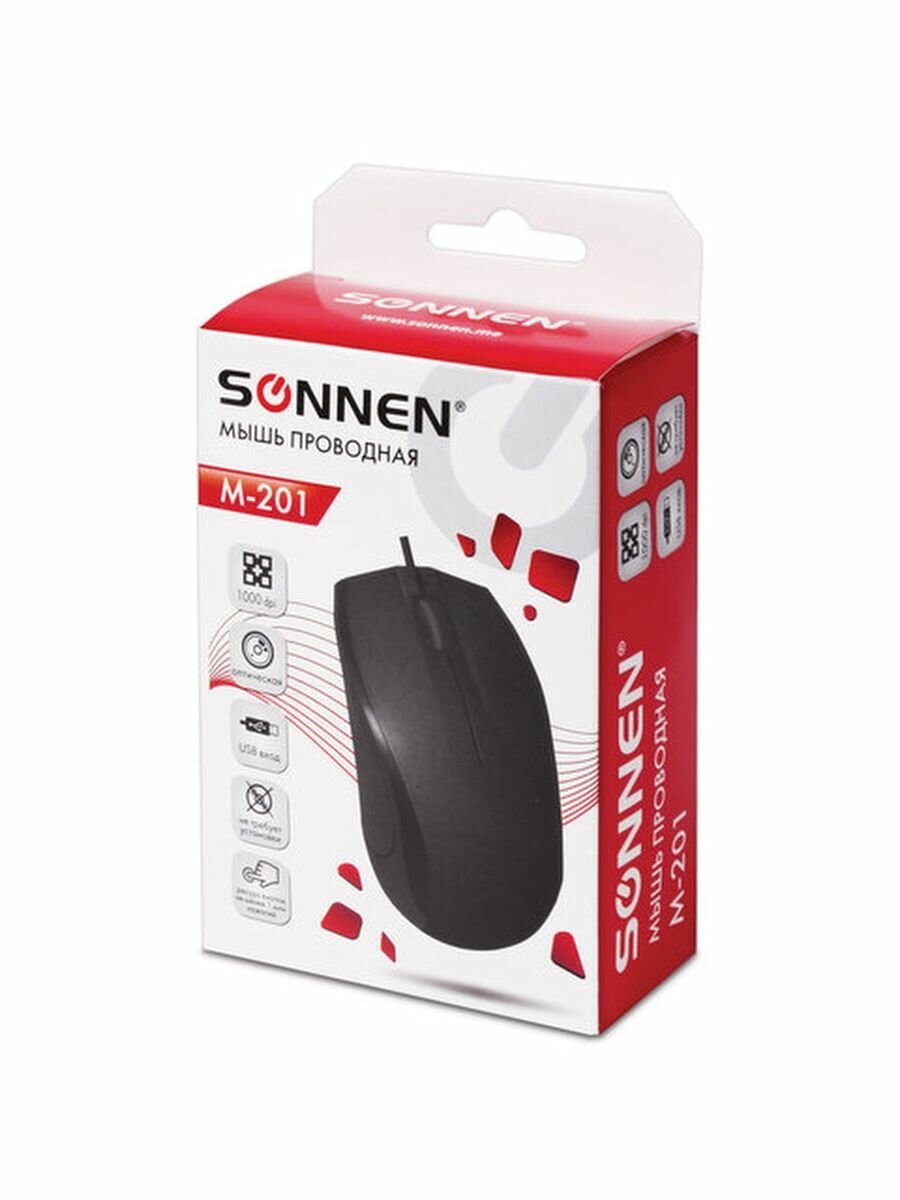 Мышь проводная SONNEN М-201, USB, 1000 dpi, 2 кнопки + колесо-кнопка, оптическая, черная, 512631