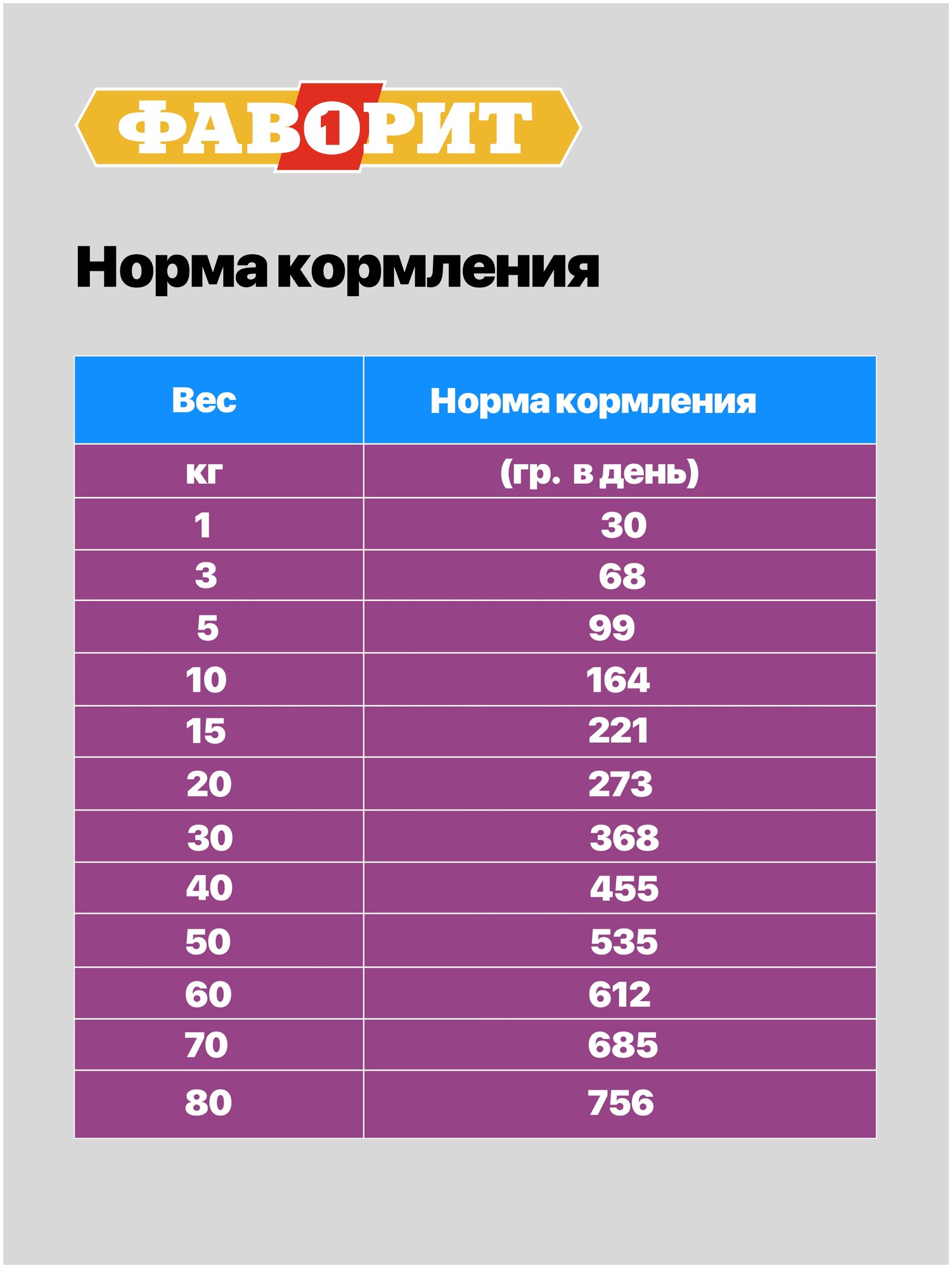 | Дозировка | Вес Норма кормления (кг) (гр. вдень) 1 30 3 68 5 99 10 164 15 221 20 273 30 368 40 455 50 535 60 612 70 685 80 756 |