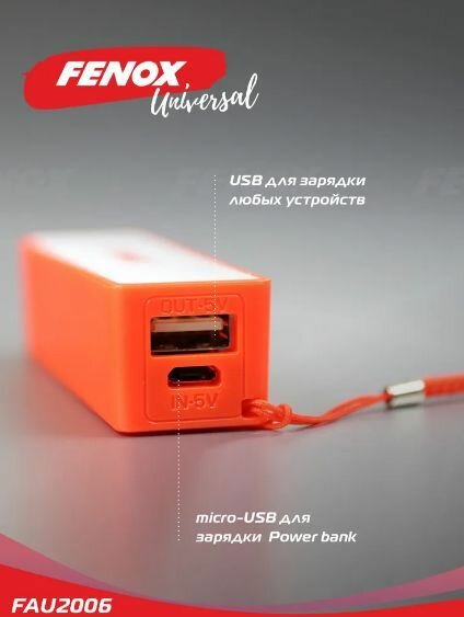 FENOX FAU2006 Внешний аккумулятор (Power bank) 1200mA ABS пластик 1200мАч MicroUSBх1А 5 В USB 5.3В 1A 9.6*2.