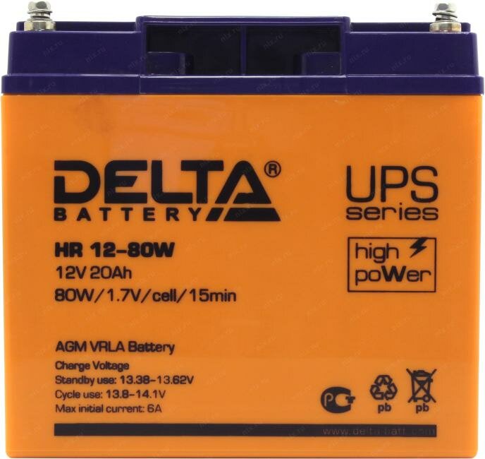 | Дополнительная информация | Аккумулятор Delta HR 12-80W полностью герметизирован, утечка из него электролита (кислоты) невозможна. Поэтому его можно транспортировать и использовать в любом удобном положении (вертикальном или горизонтальном). У батареи HR 12-80W отсутствуют ограничения на перевозку по автомобильным дорогам, по воздуху, по морю и по железной дороге. Может поставляться в версии Stendby use: 13.5 - 13.8 Cycle use: 14.1 - 14.4, либо Stendby use: 13.38 - 13.62 Cycle use: 14.4 - 14.7 |