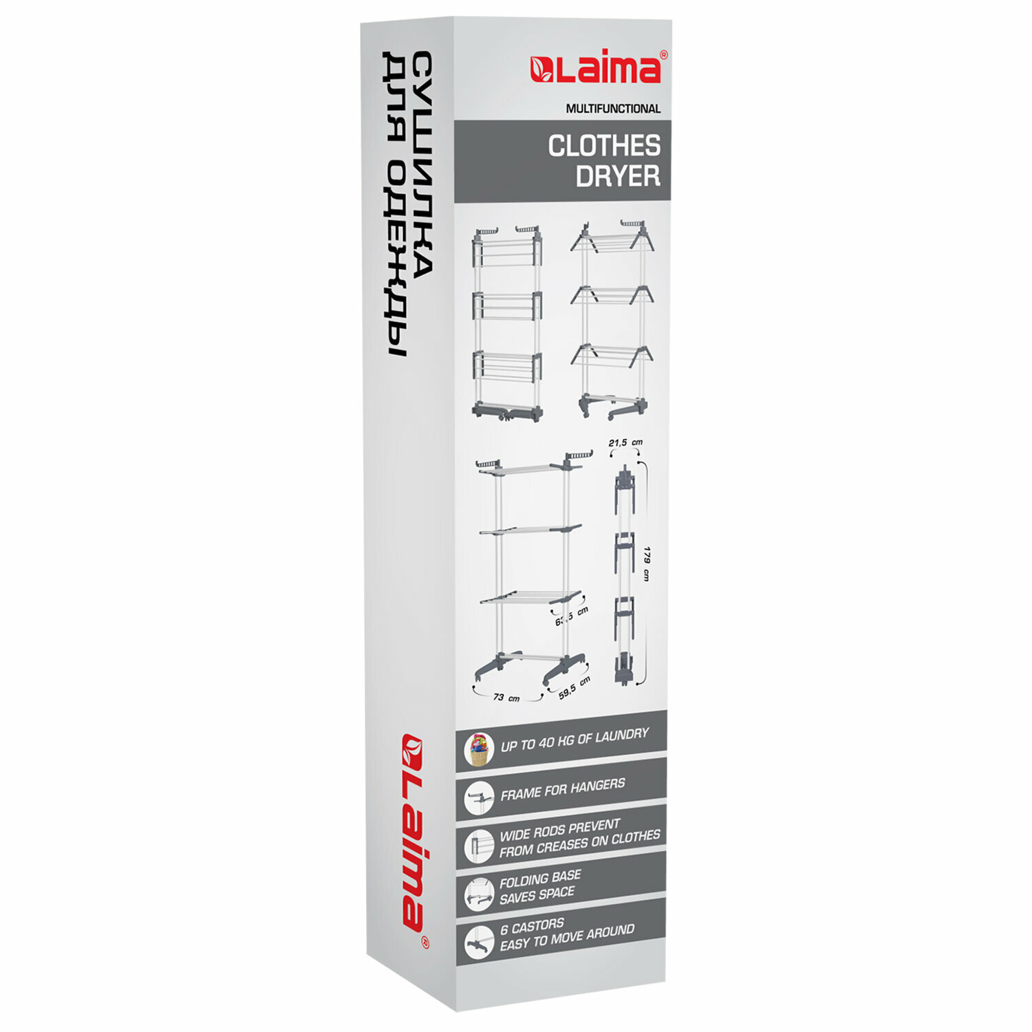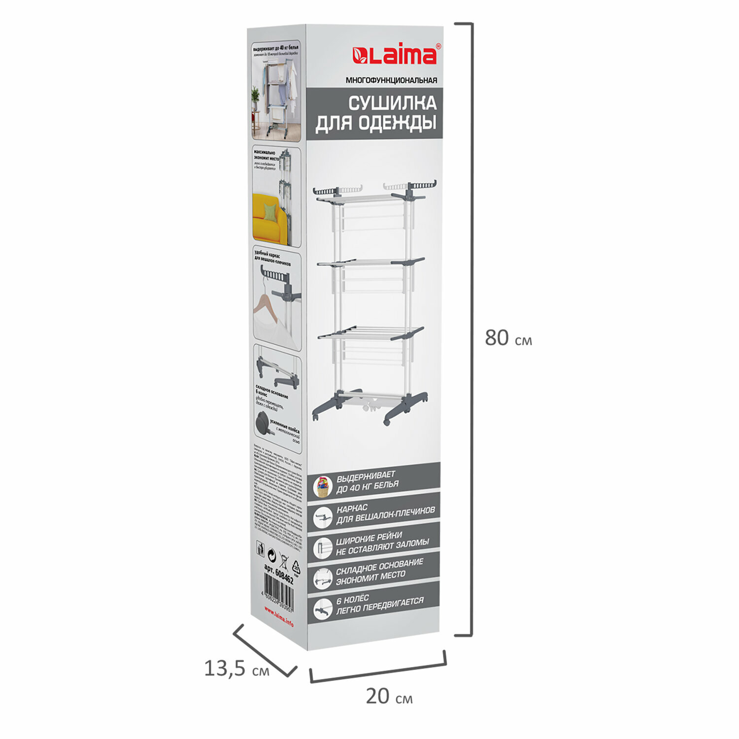Сушилка для белья напольная складная металлическая вертикальная многофункциональная, 3 уровня, на колесах, "Super Compact", складное основание, LAIMA HOME, 608462