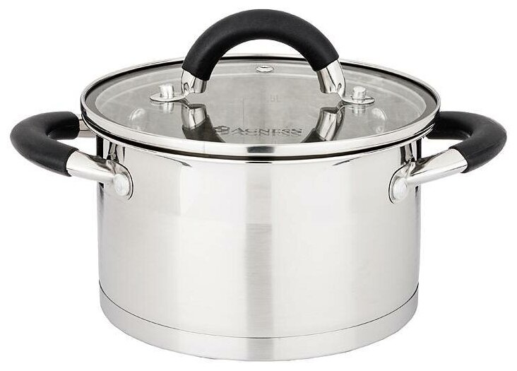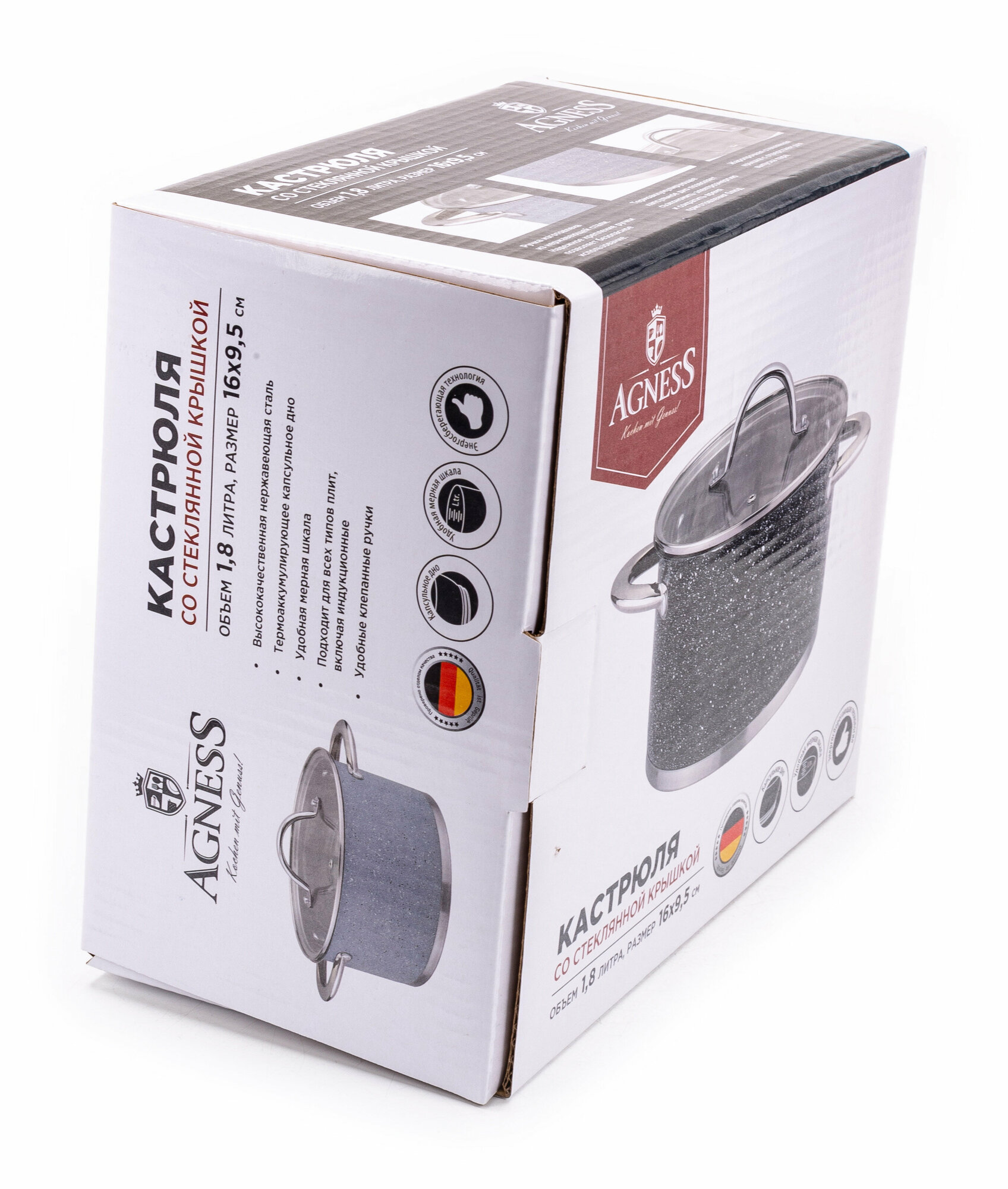 Кастрюля 1,8 л нержавеющая сталь со стеклянной крышкой, для индукционных плит Agness Midnight, нержавейка 1,8 литра для газовой плиты