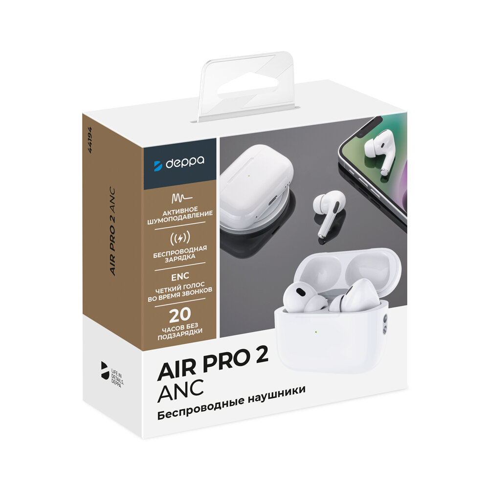Беспроводные наушники с микрофоном Air Pro ANC, TWS, BT 5.2, 300 мАч, ANC, QI, белый, Deppa 44194-OZ/ Без заводской упаковки