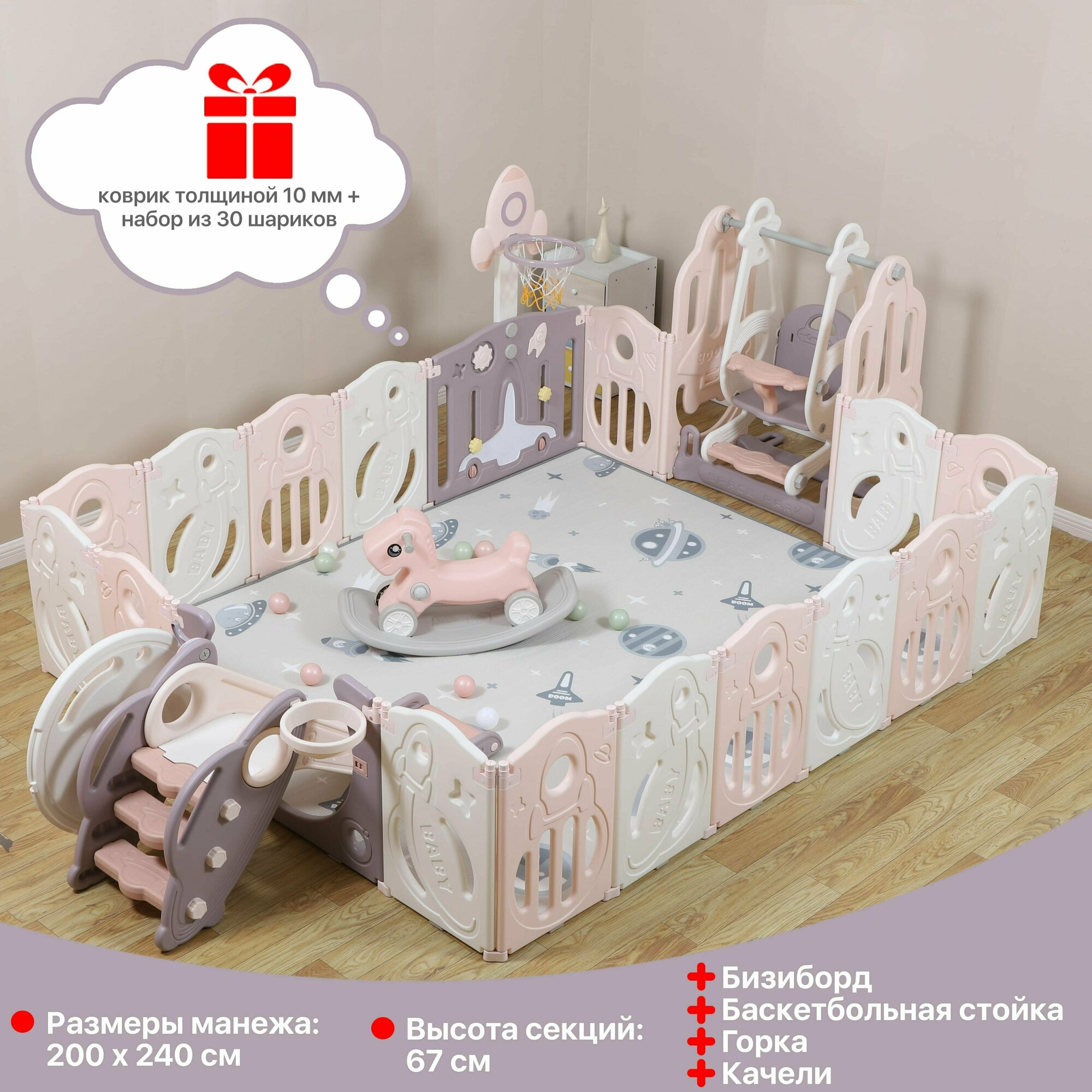 Манеж UNIX Kids "SUPREME Space" Rose, розовый/белый, 200x240 см, с качелями, ковриком, горкой и баскетбольным кольцом для дома и улицы