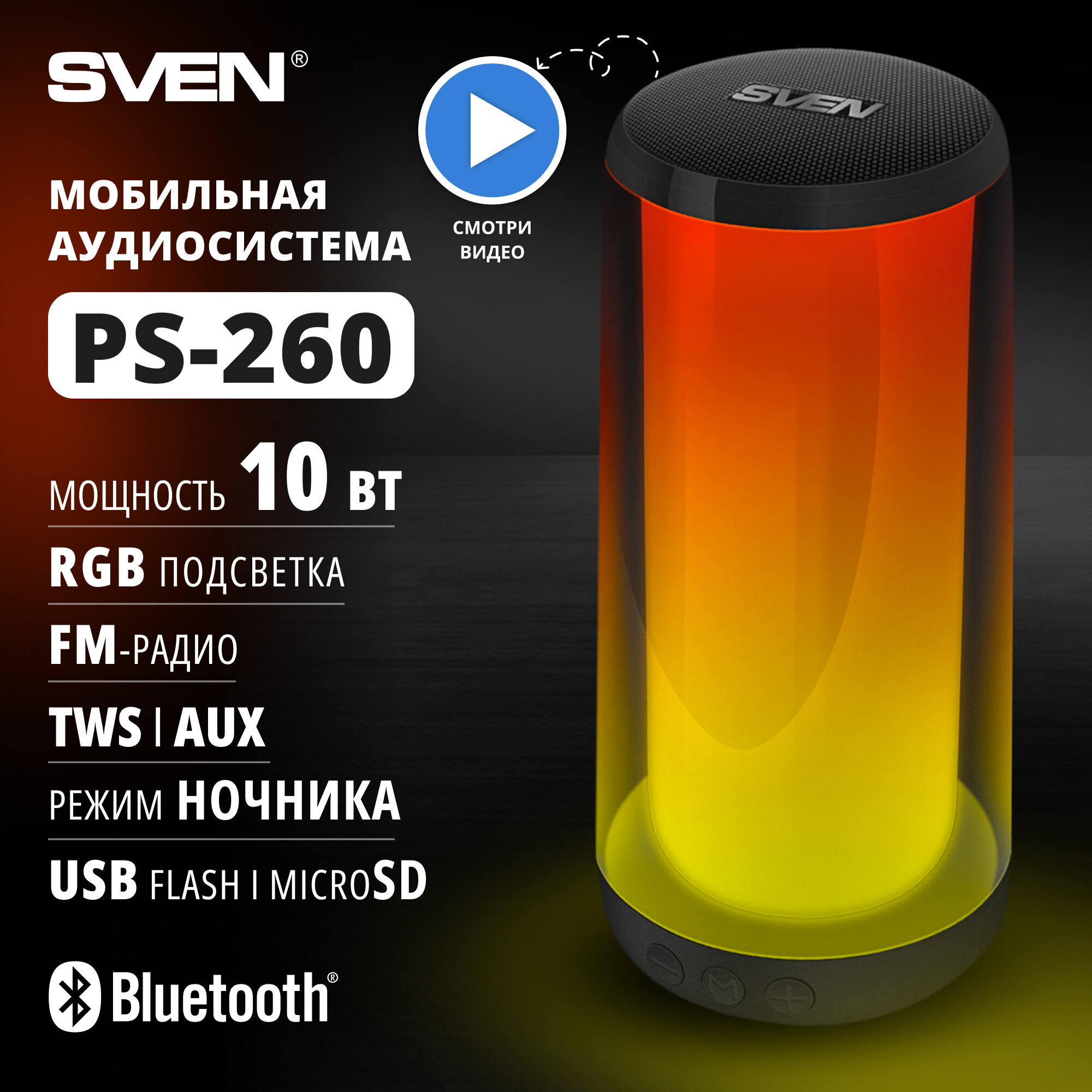 Портативная колонка Sven PS-260, 10 W, Bluetooth, FM, USB, microSD, подсветка, черный (SV-021337)