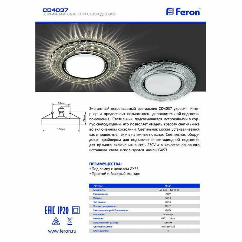 СохранитьСветильник встраиваемый с белой LED подсветкой CD4037 потолочный GX53 без лампы, прозрачный, хром, FERON 40504 (1 шт.) интересное: