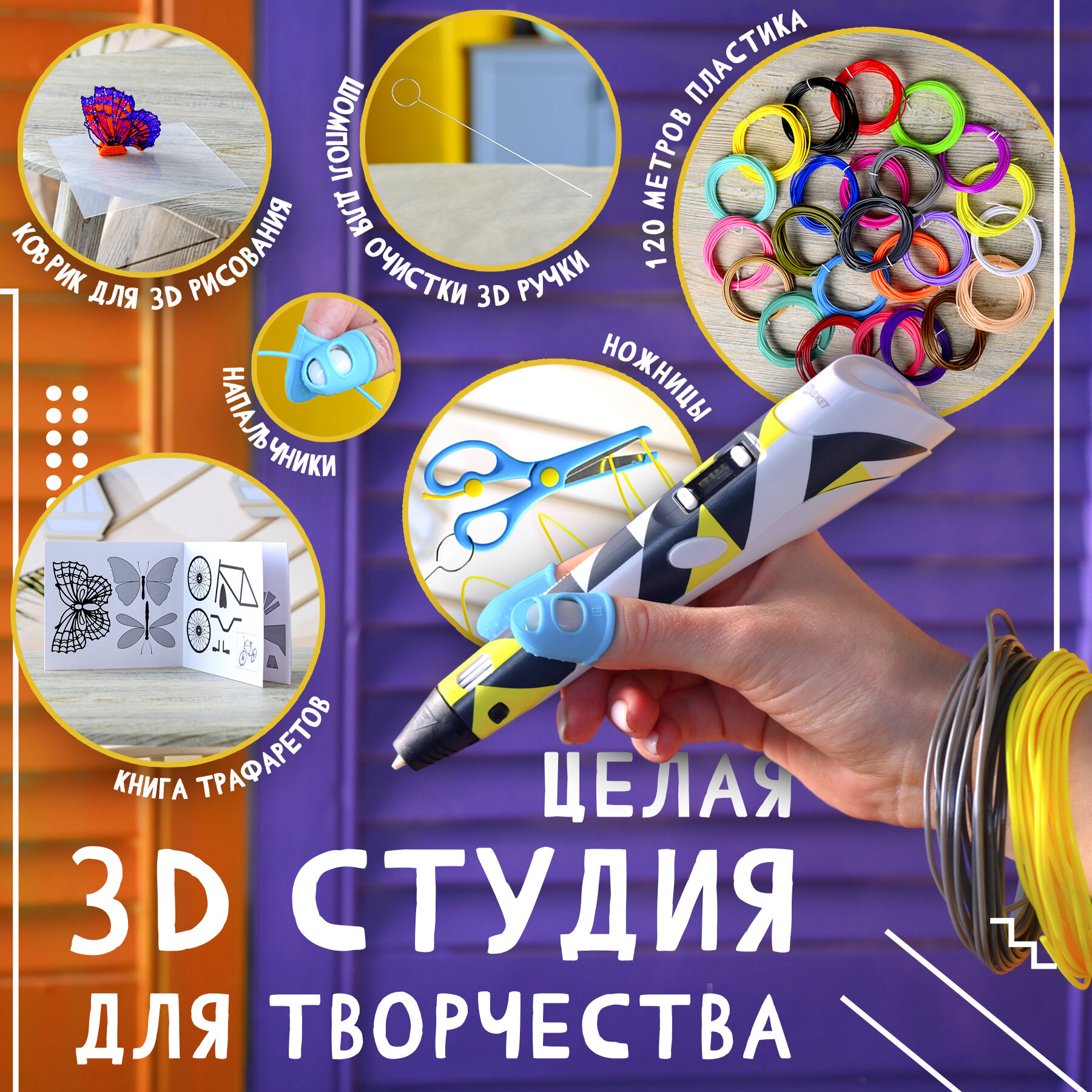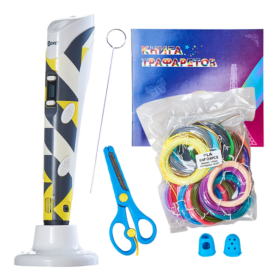 | Комплектация | 3D ручка; Сетевой адаптер; PLA пластик, 24 цвета по 5 метров; Книга трафаретов; Коврик для рисования; Шомпол для чистки ручки; Силиконовые напальчники; Подставка для ручки; Ножницы; Руководство по эксплуатации |