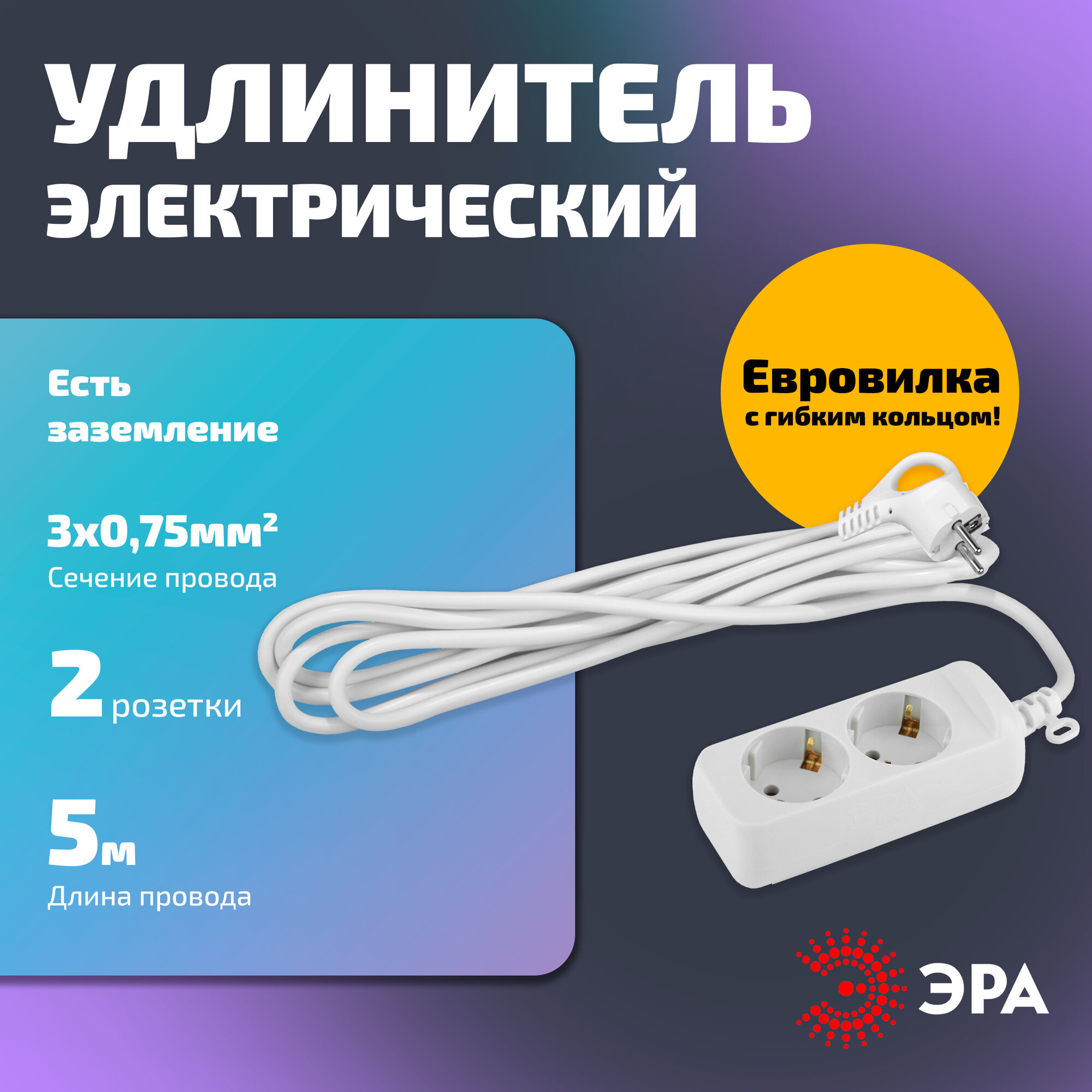 Удлинитель электрический ЭРА UX-2e-5m с заземлением 2 розетки 5м ПВС 3x0,75мм² 10А арт. Б0038574 (1 шт.)