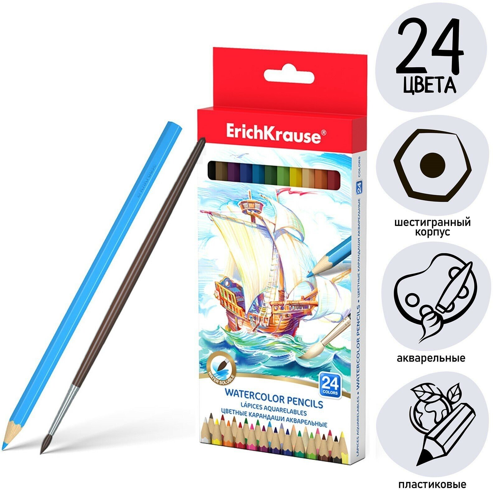 Купить ErichKrause Карандаши акварельные 24 цвета ErichKrause, шестигранные, с кисточкой