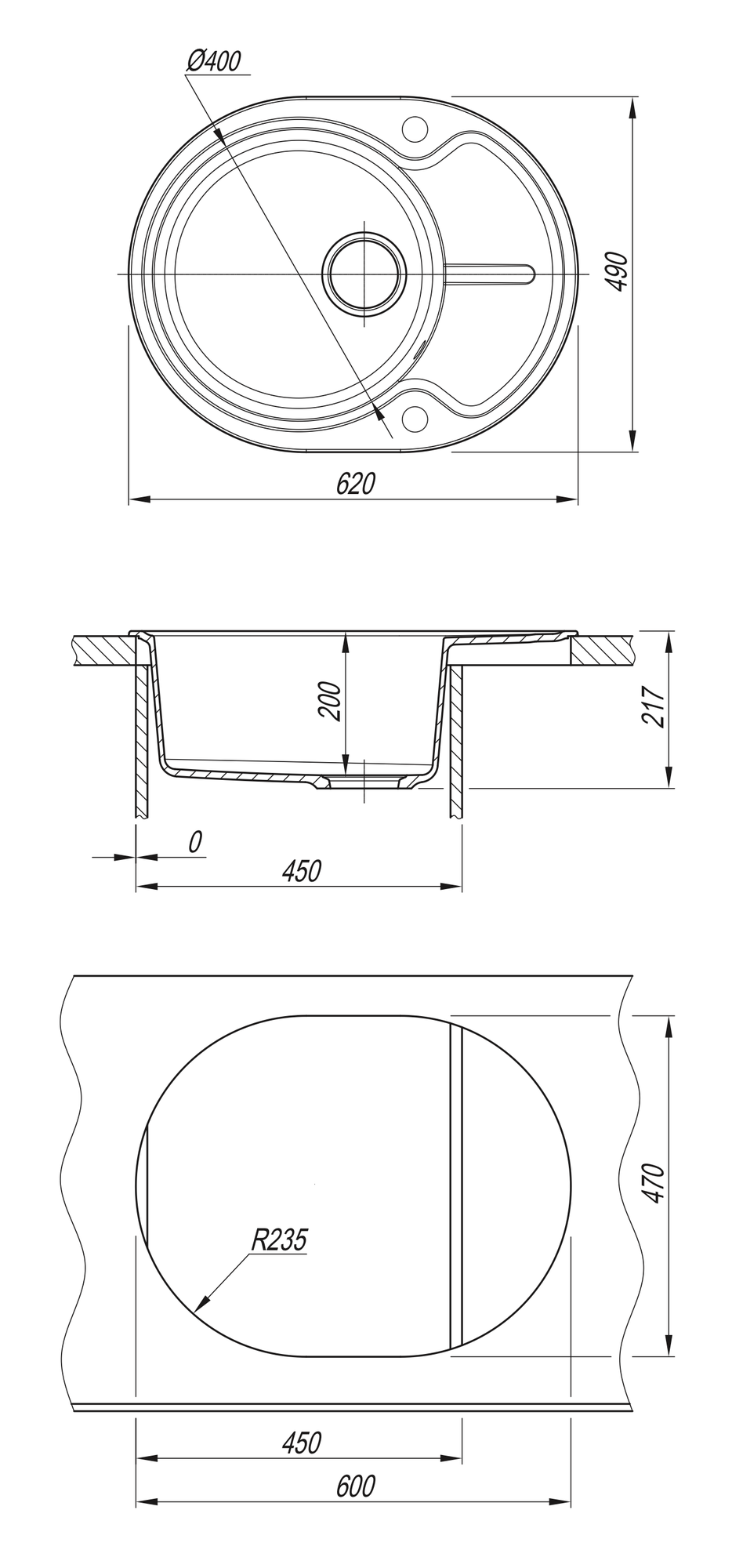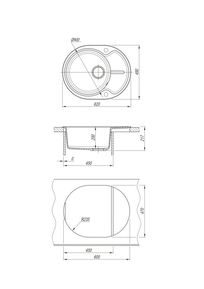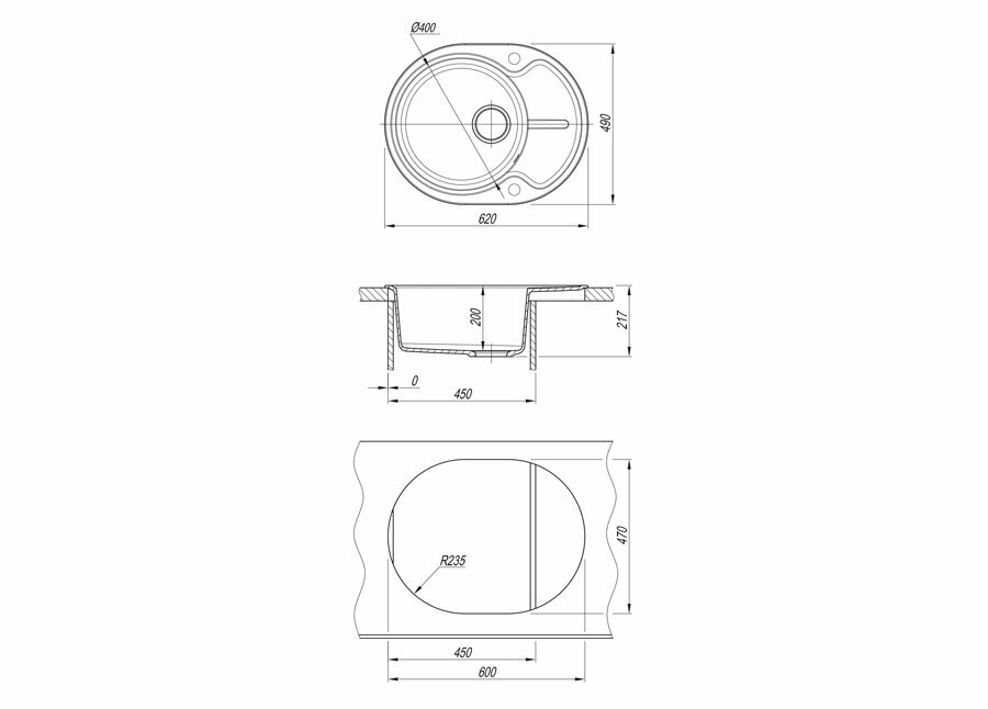 Мойка для кухни врезная каменная Dr. Gans БЕРТА-620, цвет серый, с крылом, овальная, 620х490х217 мм