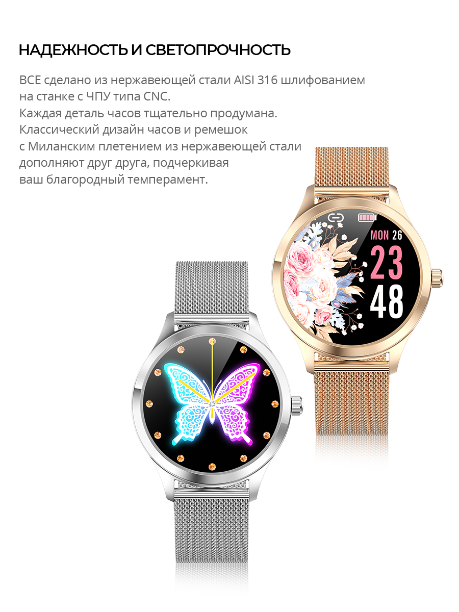 | Отзыв: | Стильные женские часы. Прекрасно упакованы, все комплектующие в заводской упаковке. Не тупят. С айфоном синхронизируются без особых проблем. Есть гарантия и инструкция от магазина на русском языке. Если что-то не понятно, менеджер из поддержки оперативно отвечают и консультируют по устройству. Покупкой довольна. |