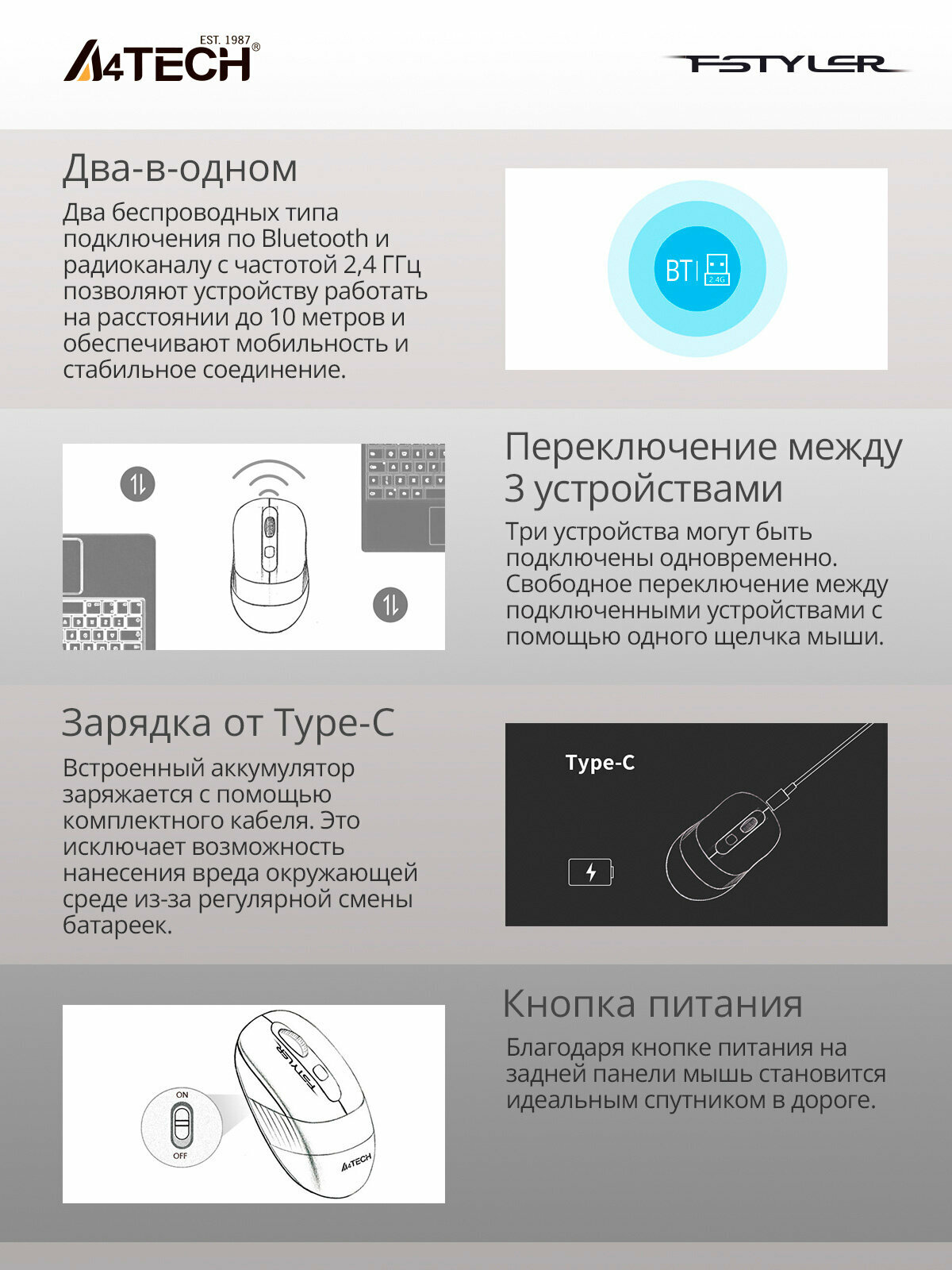 Беспроводная оптическая мышь со встроенным аккумулятором A4Tech Fstyler FB10C, 2400dpi, 4кнопки , Bluetooth/ 2.4G Radio USB, Type C