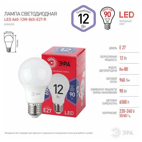 Комплект 50 шт, Лампа светодиодная ЭРА, 12(100)Вт, цоколь Е27, груша, холодный белый, 25000 ч, LED A60-12W-6500-E27, Б0045325