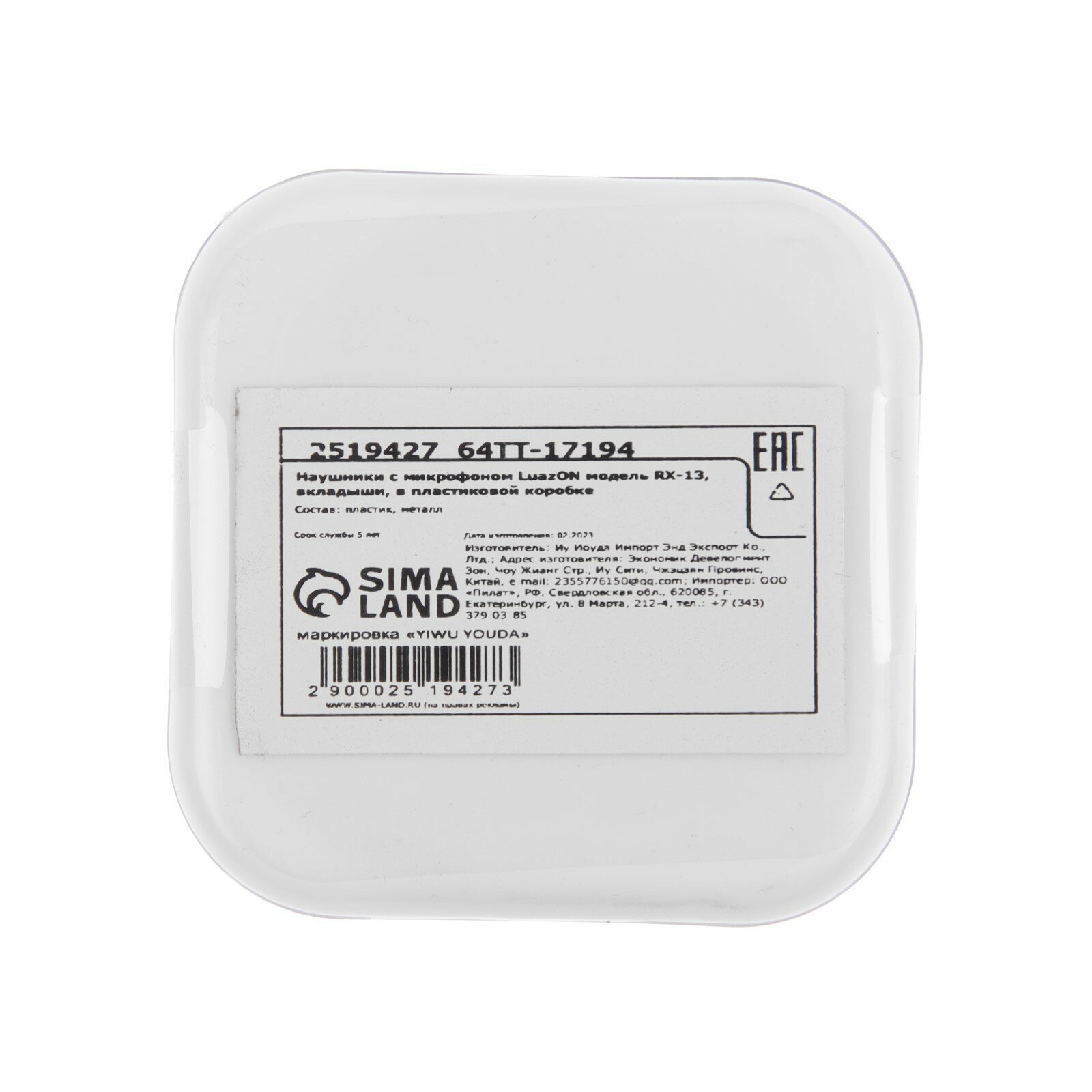 Наушники LuazON RX-13, вкладыши, микрофон, синие 2519419