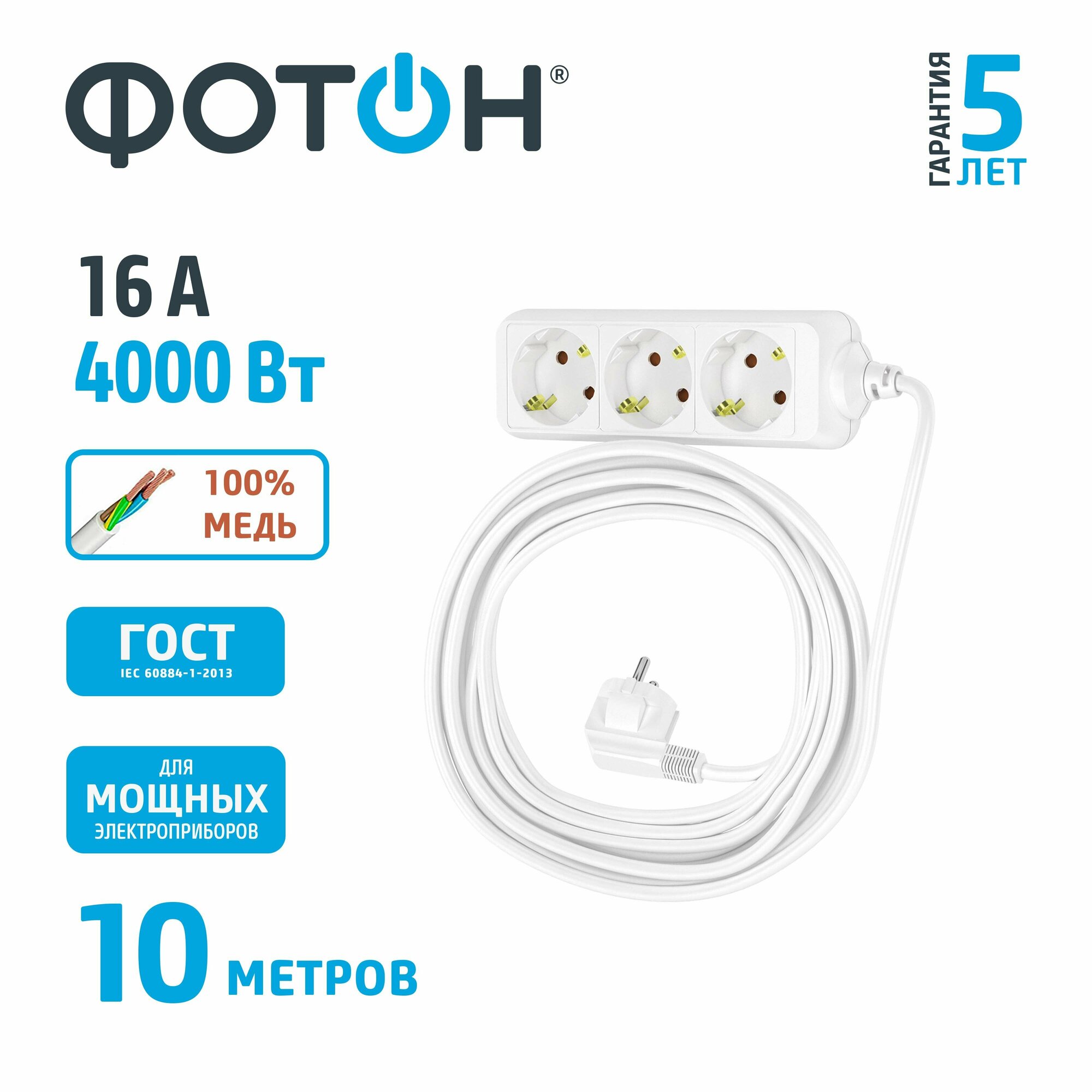 Сетевой удлинитель Фотон 16-103Е, 10м, 3 розетки с заземлением, 16А, белый, 1 шт.