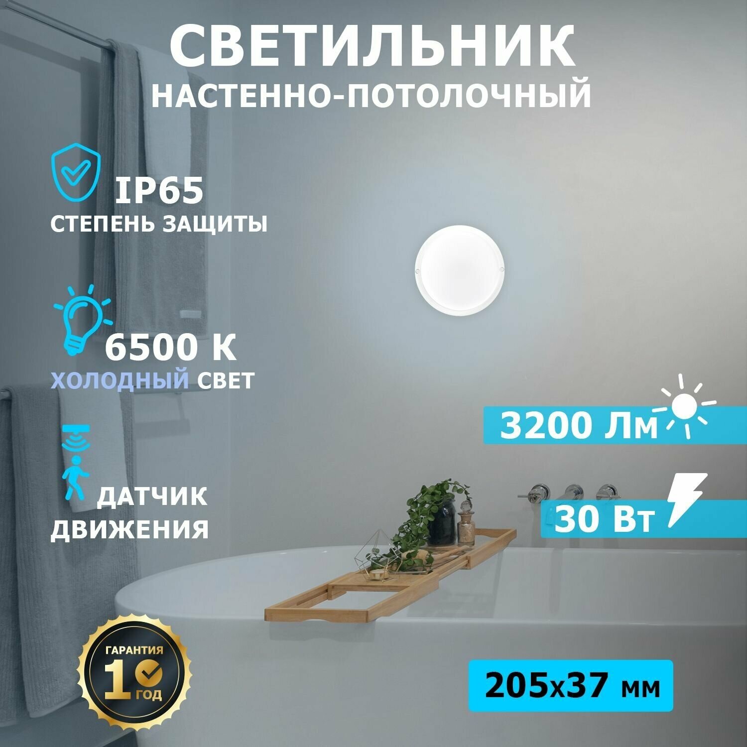 Светильник светодиодный пылевлагозащищенный REXANT ЖКХ-01 круг 30Вт 3200Лм IP65 6500K 210х37мм с датчиком