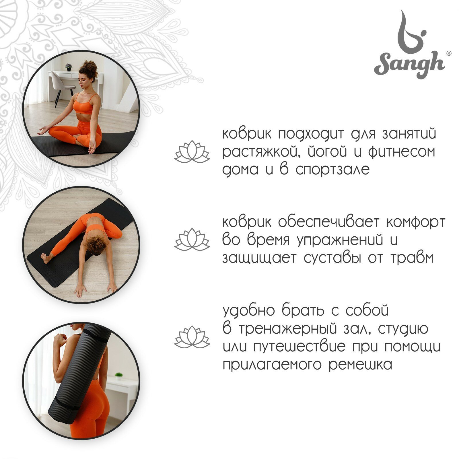 Коврик для йоги Sangh, 183×61×1,5 см, цвет чёрный интересное: