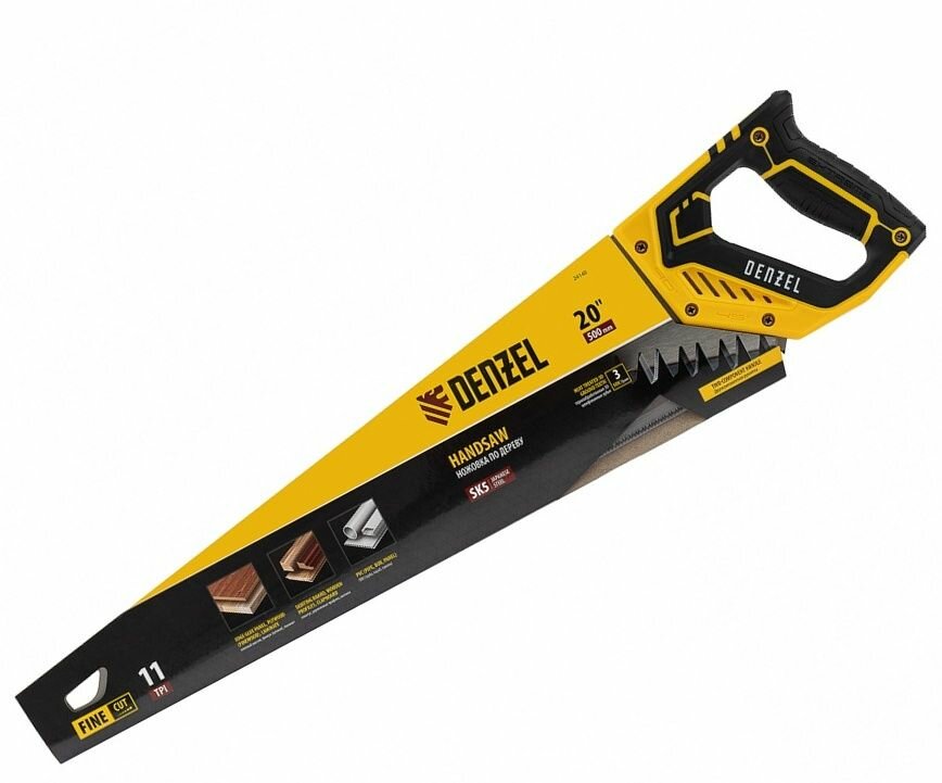Ножовка по дереву, 500 мм, 11 TPI, зуб 3D, двухкомпонентная рукоятка Denzel