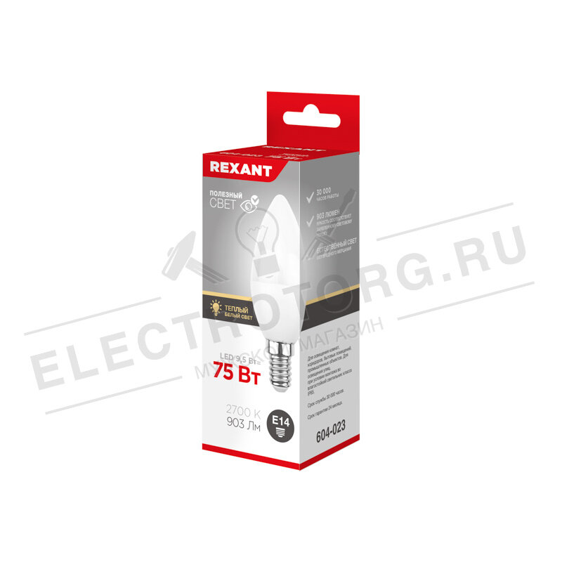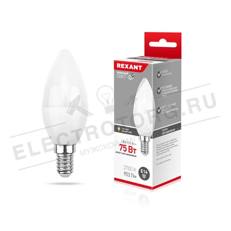 Светодиодная лампа REXANT Свеча E14, 9.5 Вт, 903 Лм (=75 Вт), 2700 K (теплый свет), упаковка 10 шт.