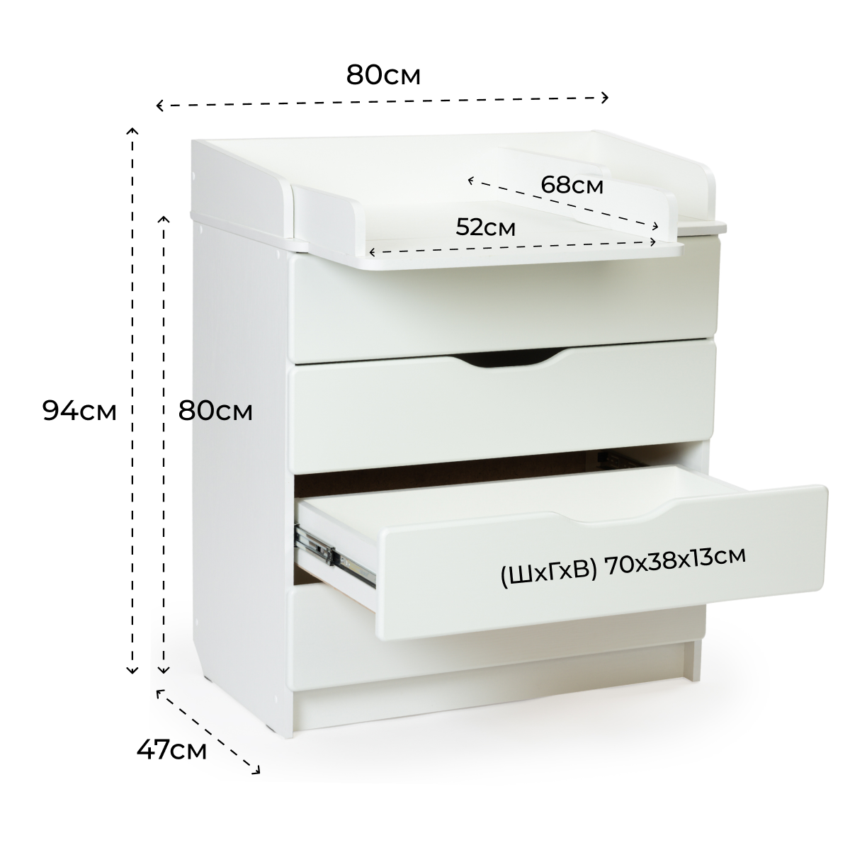 | Дополнительная информация | комод имеет откидной пеленальный столик, длина пеленального столика - 52 см |