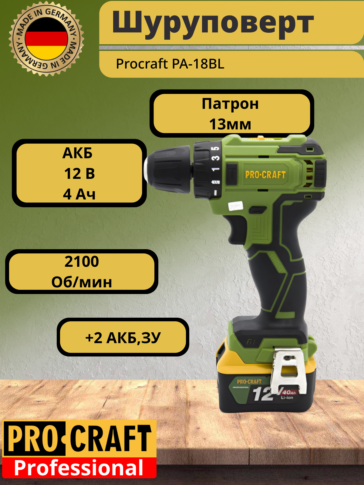 Купить Шуруповерт аккумуляторный бесщеточный Procraft PI-18 BL , 12 В, патрон 10мм, 1350об/мин