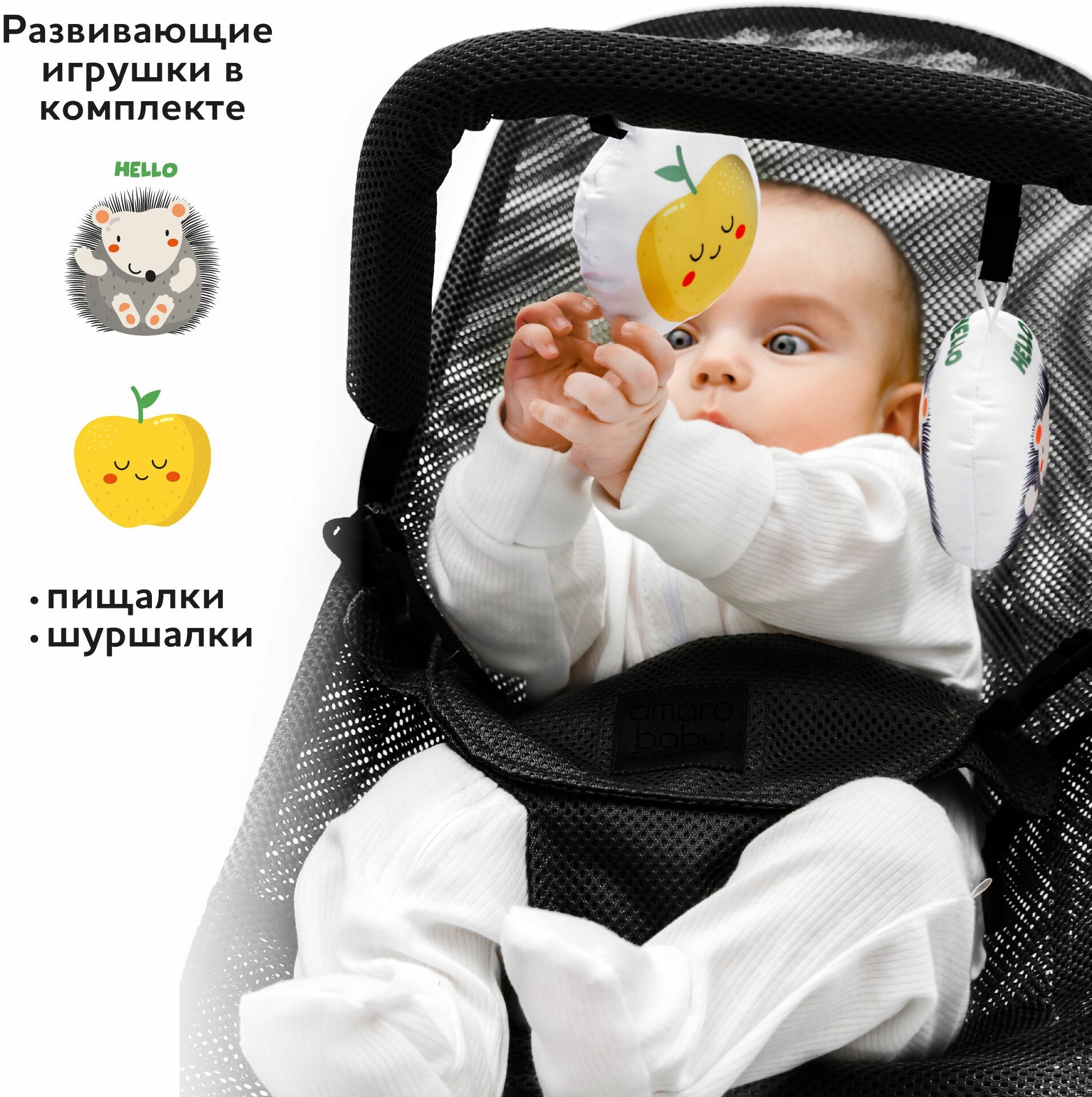 Ребенок в безопасности, стирается чехол и сохнет очень быстро, мобильный! Ребенок качается сам и играет! Находка для мам! |