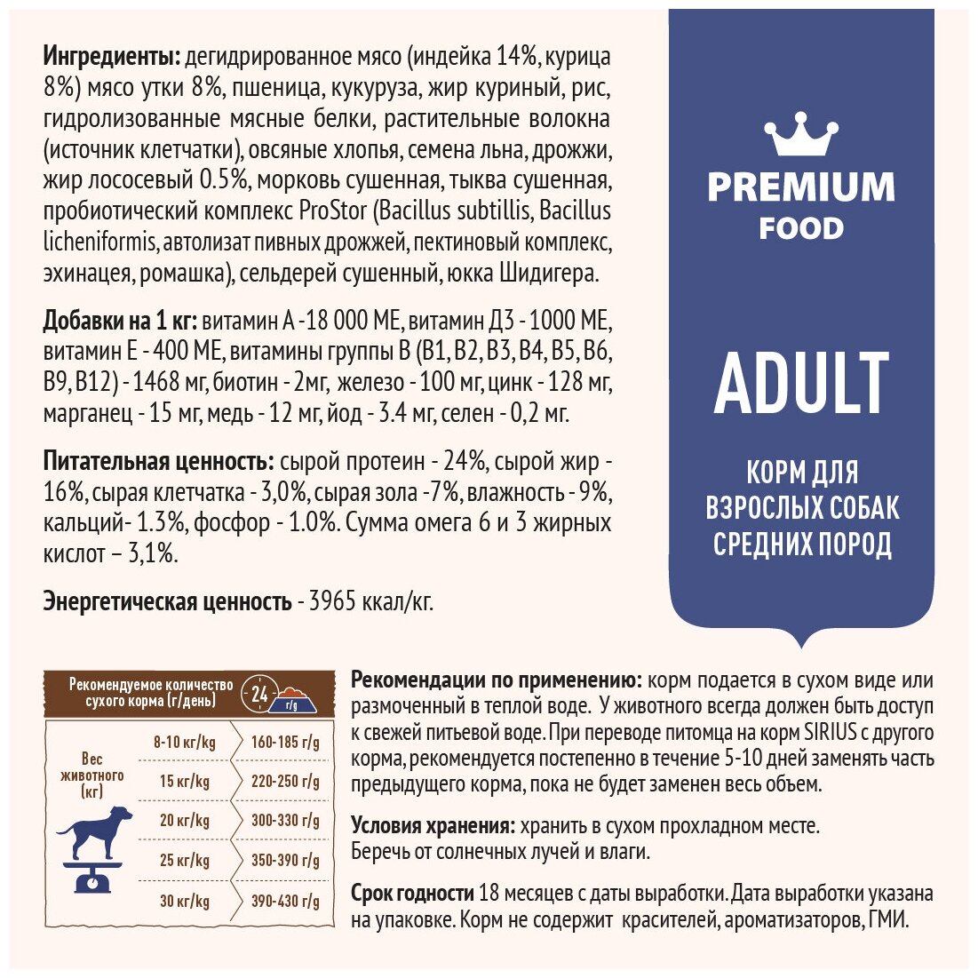SIRIUS сух.д/собак средних пород Индейка и Утка 12кг интересное: